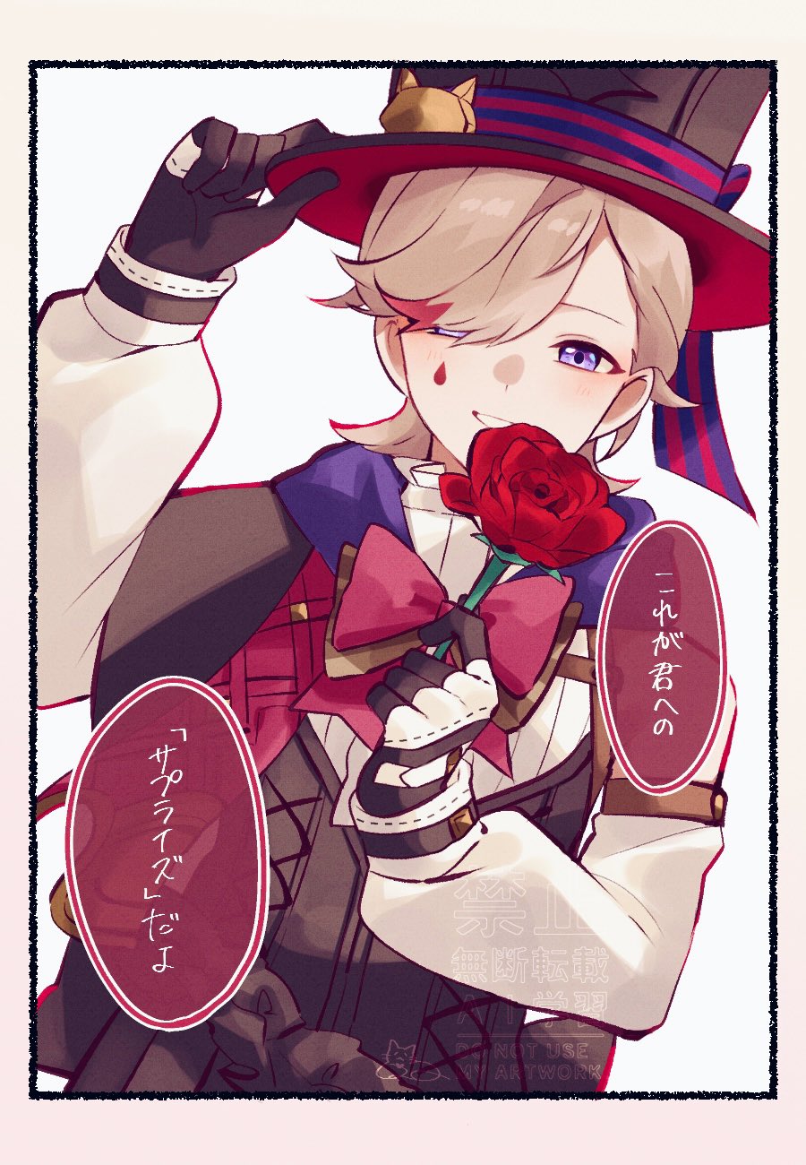 1boy black_capelet black_corset black_gloves black_hat blonde_hair blush border bow bowtie brown_bow brown_bowtie capelet corset detached_sleeves facial_mark flower frilled_shirt_collar frills genshin_impact gloves hand_on_headwear hand_up hat highres holding holding_flower long_sleeves looking_at_viewer lyney_(genshin_impact) male_focus multicolored_gloves multicolored_hair nekorin_chu parted_bangs parted_lips purple_eyes red_bow red_bowtie red_flower red_rose red_streaks rose shirt short_hair simple_background sleeveless sleeveless_shirt smile solo speech_bubble streaked_hair swept_bangs teardrop_facial_mark top_hat translation_request two-tone_gloves watermark white_background white_gloves white_shirt white_sleeves