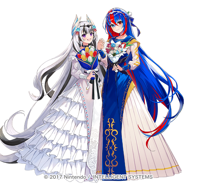 2girls aerial_fireworks black_collar black_hair blue_dress blue_eyes blue_hair blush bouquet braid breasts closed_mouth collar commentary_request copyright_notice crossed_bangs dress feather_hair_ornament feathers female_alear_(fire_emblem) female_alear_(sister_dragons)_(fire_emblem) fire_emblem fire_emblem_engage fire_emblem_heroes fireworks flower grey_hair greyscale hair_between_eyes hair_ornament heterochromia holding holding_bouquet holding_hands ichikawa_haru long_hair long_sleeves looking_at_viewer monochrome multicolored_hair multiple_girls nintendo official_alternate_costume official_art open_mouth purple_eyes red_eyes red_hair siblings simple_background sisters smile split-color_hair tiara two-tone_hair very_long_hair veyle_(fire_emblem) veyle_(sister_dragons)_(fire_emblem) wavy_hair white_background white_dress wing_hair_ornament