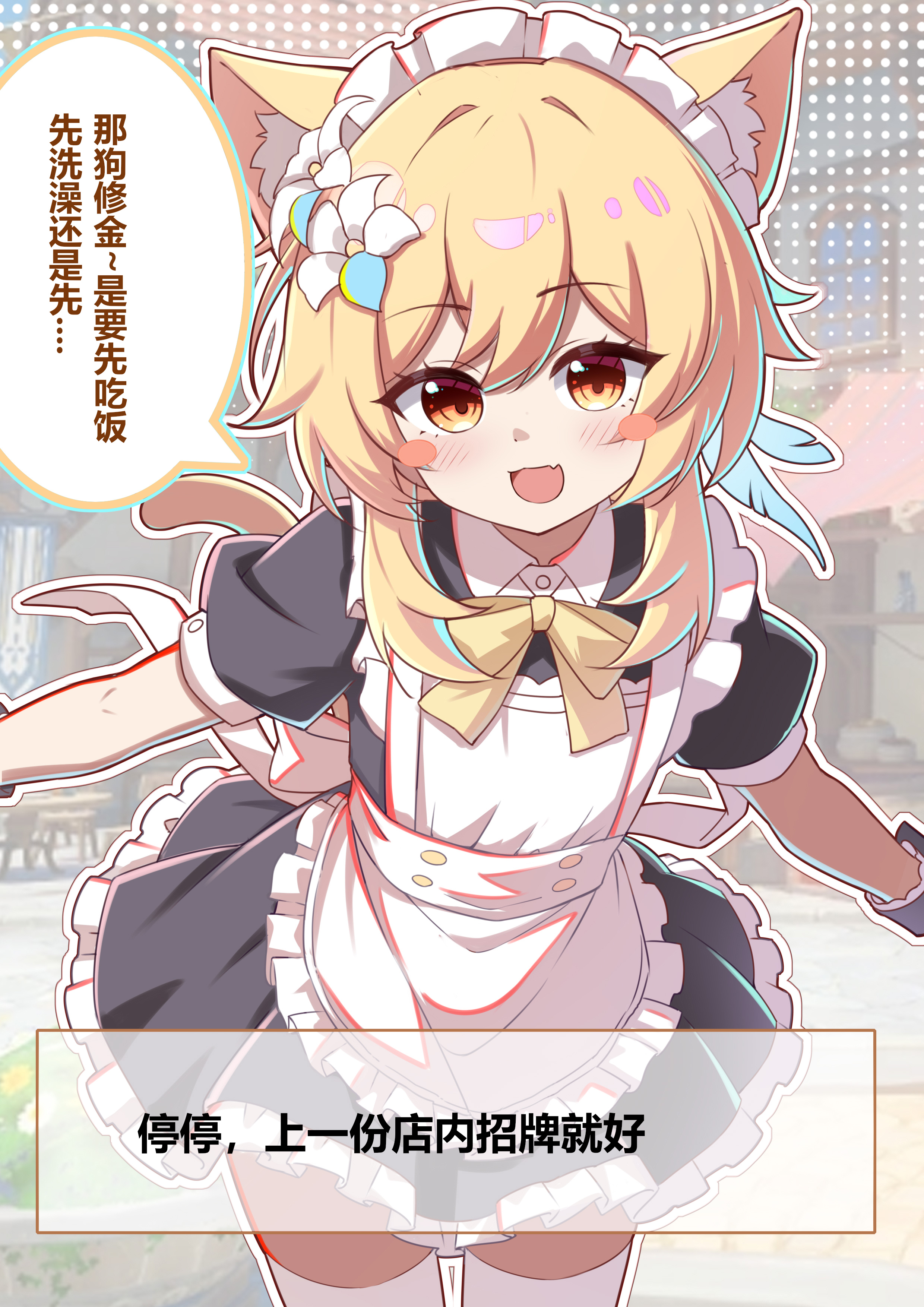 1girl :d absurdres alternate_costume animal_ear_fluff animal_ears apron black_dress blonde_hair blush cat_ears cat_tail chinese_commentary commentary_request dress enmaided fang flower frilled_apron frilled_hairband frills genshin_impact hair_between_eyes hair_flower hair_ornament hairband highres kemonomimi_mode leaning_forward lumine_(genshin_impact) maid maid_headdress open_mouth orange_eyes short_hair_with_long_locks skin_fang smile solo tail translation_request variant_set white_apron white_flower white_hairband yaoli_(ysxbd)