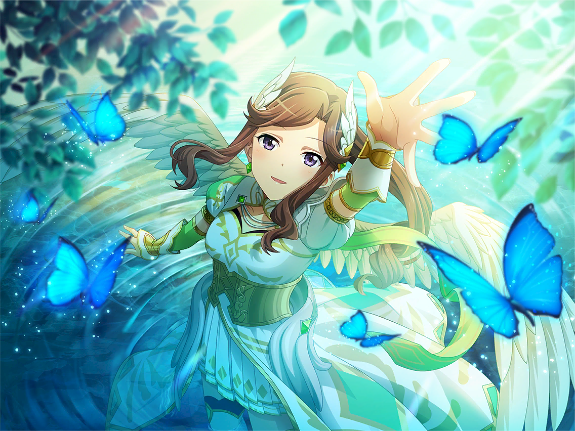 1girl angel_wings archangel_raphael archangel_raphael_(cosplay) arm_up brown_hair bug butterfly cosplay dress from_above game_cg headpiece insect long_hair looking_at_viewer looking_up official_art parted_lips ponytail puffy_short_sleeves puffy_sleeves purple_eyes short_sleeves shoujo_kageki_revue_starlight shoujo_kageki_revue_starlight_-re_live- sidelocks skirt solo standing tendou_maya the_bible upper_body water white_dress white_skirt white_wings wings wrist_guards