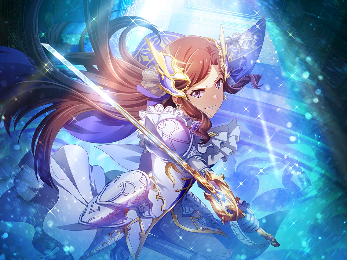 1girl armor arthurian_legend ascot brown_hair cosplay dress earrings fighting_stance floating_hair game_cg gloves grey_dress grey_gloves headpiece holding holding_sword holding_weapon jewelry looking_at_viewer official_art parted_lips purple_eyes shoujo_kageki_revue_starlight shoujo_kageki_revue_starlight_-re_live- sidelocks smile solo spotlight sword tendou_maya tristan_(mythology) tristan_(mythology)_(cosplay) upper_body v-shaped_eyebrows weapon white_ascot