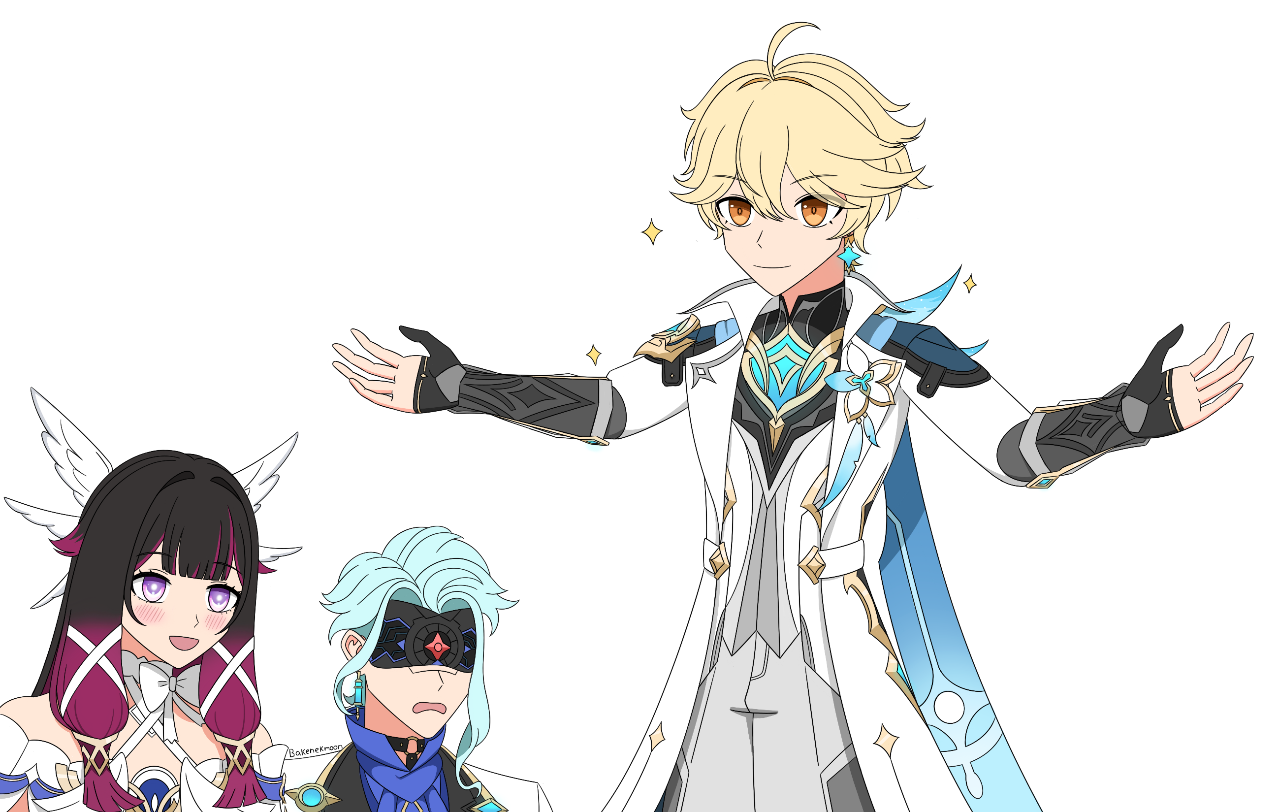 1girl 2boys aether_(as_heaven_and_earth_are_made_anew)_(genshin_impact) aether_(genshin_impact) alternate_costume bakenekmoon black_hair blonde_hair blue_hair blush columbina_(genshin_impact) dottore_(genshin_impact) dress flower genshin_impact head_wings highres multiple_boys official_alternate_costume one-eyed unusually_open_eyes white_dress wings