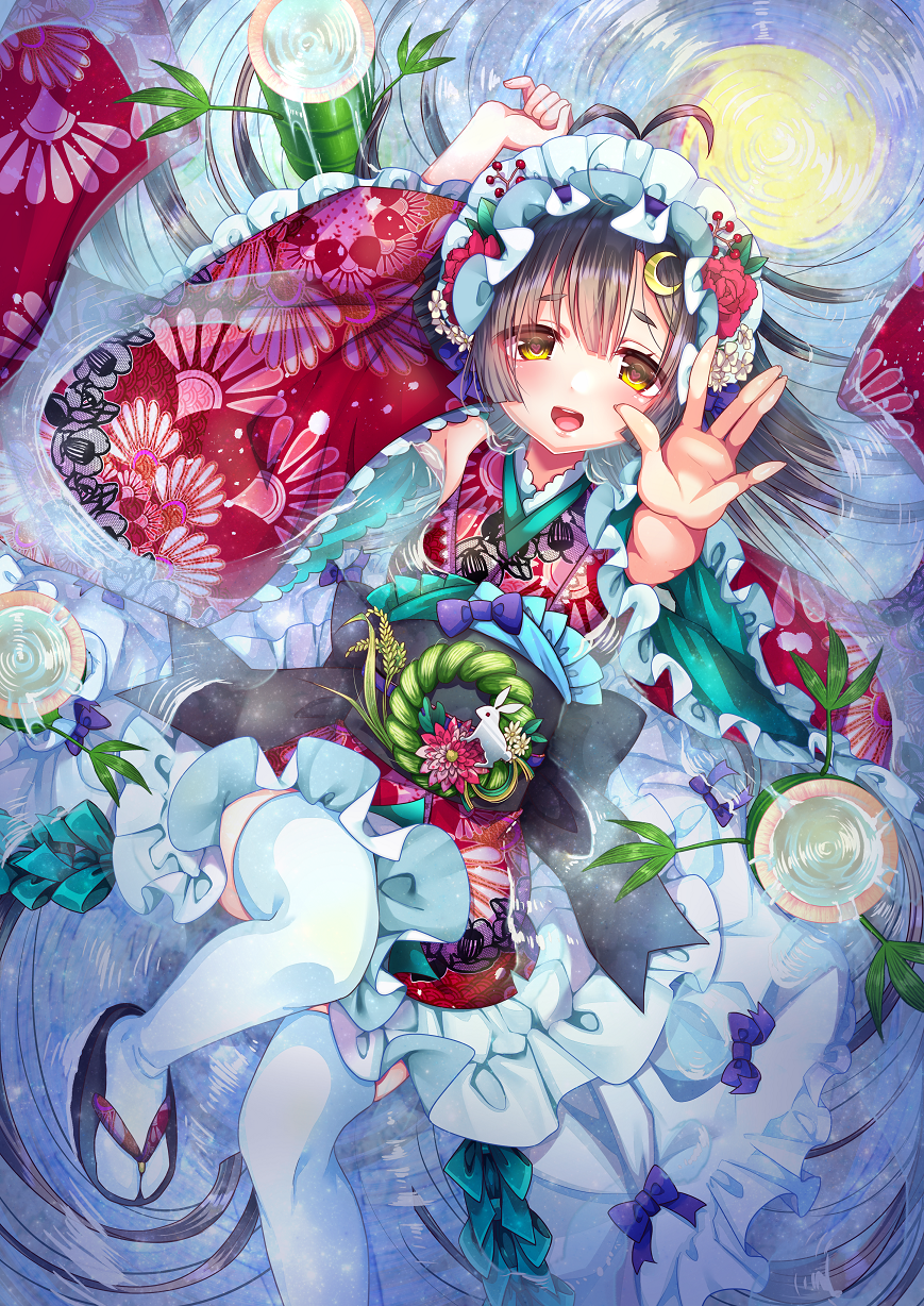 1girl bamboo black_hair bonnet commentary_request frilled_skirt frilled_sleeves frills highres hime_cut japanese_clothes kimono_dress leaf lolita_fashion looking_at_viewer obi open_mouth original reaching sash short_hair skirt smile teltelhousi thighhighs wa_lolita white_thighhighs wide_sleeves yellow_eyes