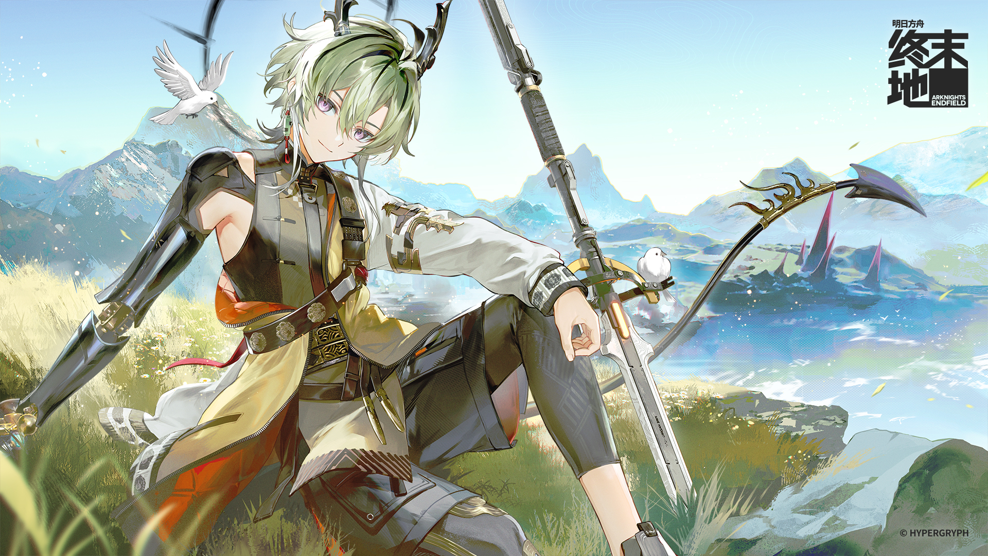 1boy arknights arknights:_endfield armor armpits bike_shorts bird black_shirt black_shorts commentary_request dove dragon_boy dragon_horns dragon_tail feet_out_of_frame grass green_hair head_tilt highres horns hou_(ppo) jacket lifeng_(arknights) long_sleeves looking_at_viewer male_focus mountainous_horizon off_shoulder official_art outdoors polearm purple_eyes shirt shorts shoulder_armor sitting smile solo spear tail weapon white_jacket yellow_jacket