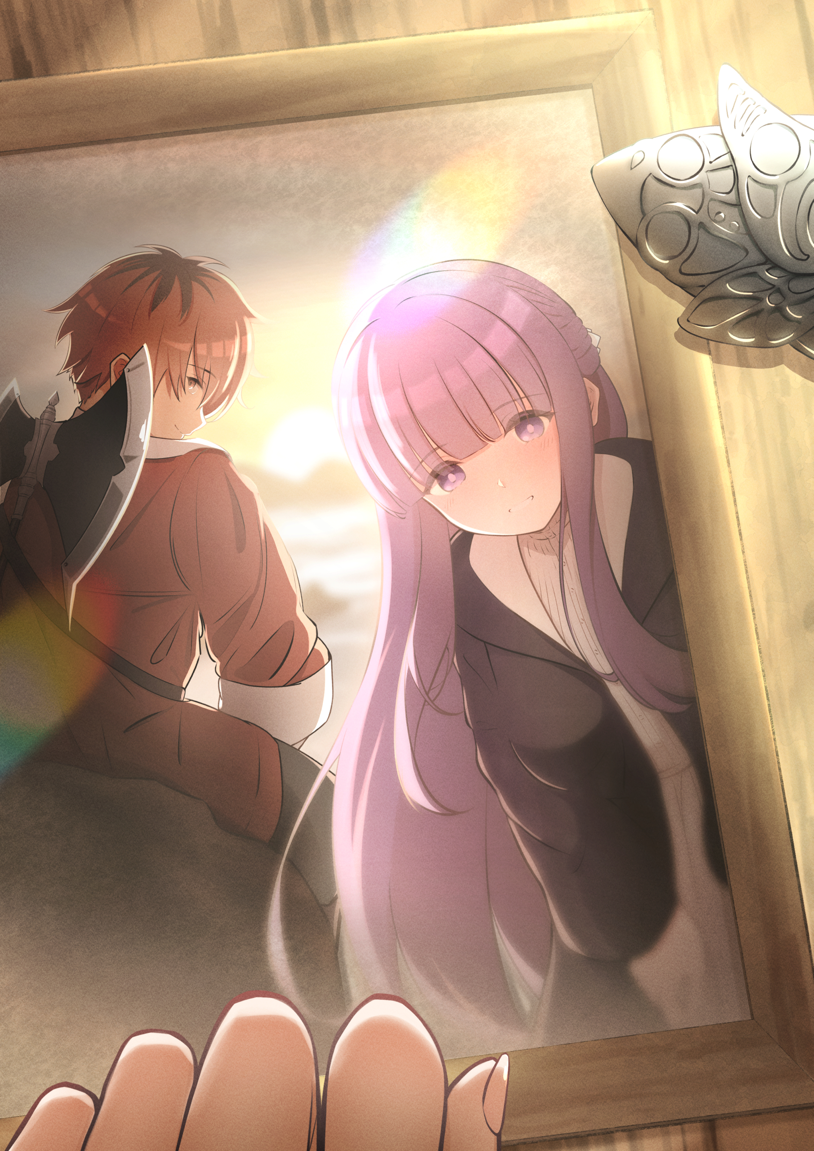 1boy 1girl axe battle_axe black_coat coat commentary_request dress fern_(sousou_no_frieren) hair_ornament highres long_hair looking_back mashiro_(user_65392488) mixed-language_commentary photo_(object) picture_frame pov pov_hands purple_eyes purple_hair red_hair red_shirt shirt short_hair smile sousou_no_frieren stark_(sousou_no_frieren) sun sunrise unworn_hair_ornament very_long_hair weapon weapon_on_back white_dress