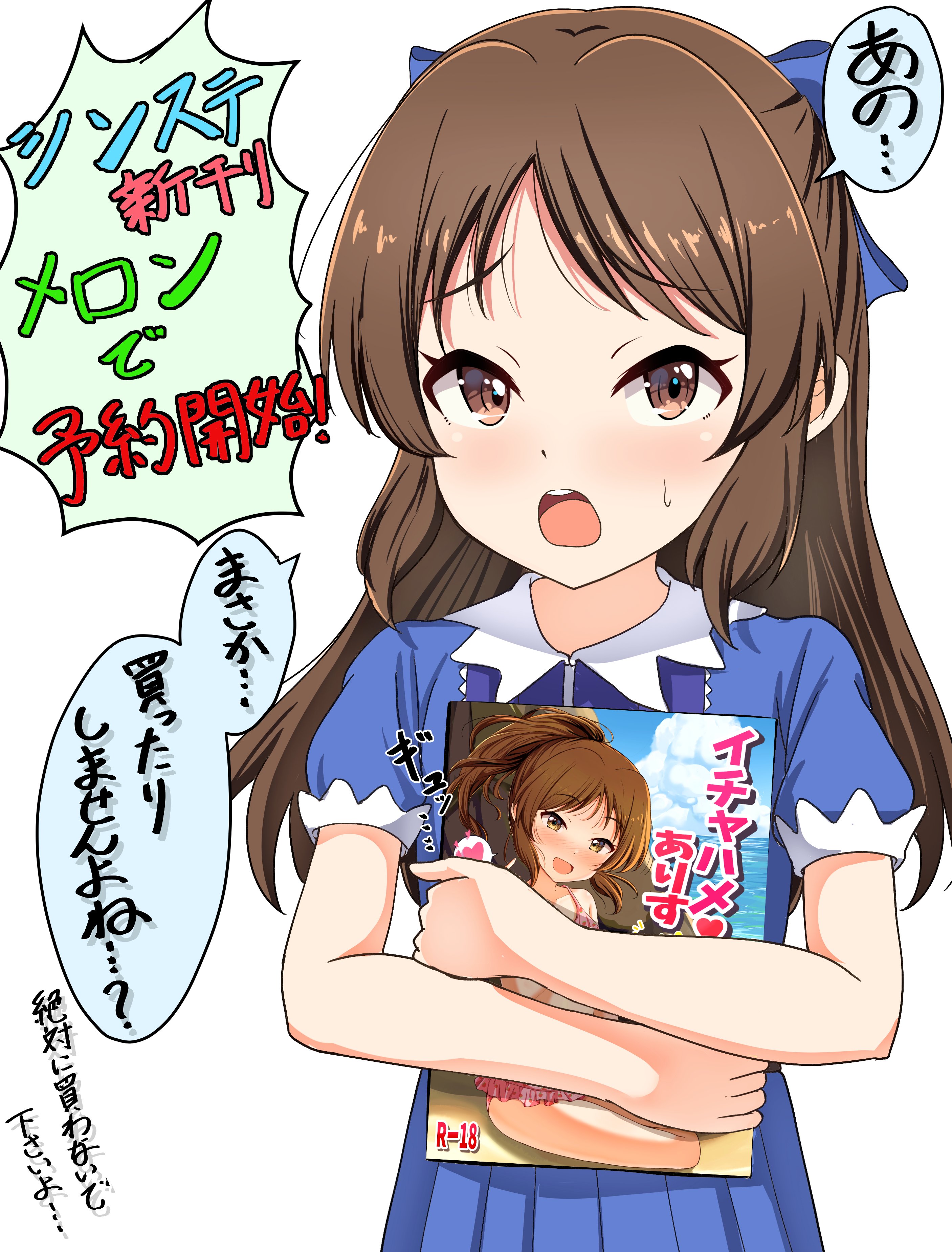 1girl absurdres blue_dress blush bow brown_eyes brown_hair choudai-sama commentary_request dress hair_bow highres holding hugging_object idolmaster idolmaster_cinderella_girls long_hair looking_at_viewer open_mouth puffy_short_sleeves puffy_sleeves short_sleeves simple_background solo speech_bubble tachibana_arisu talking translation_request white_background