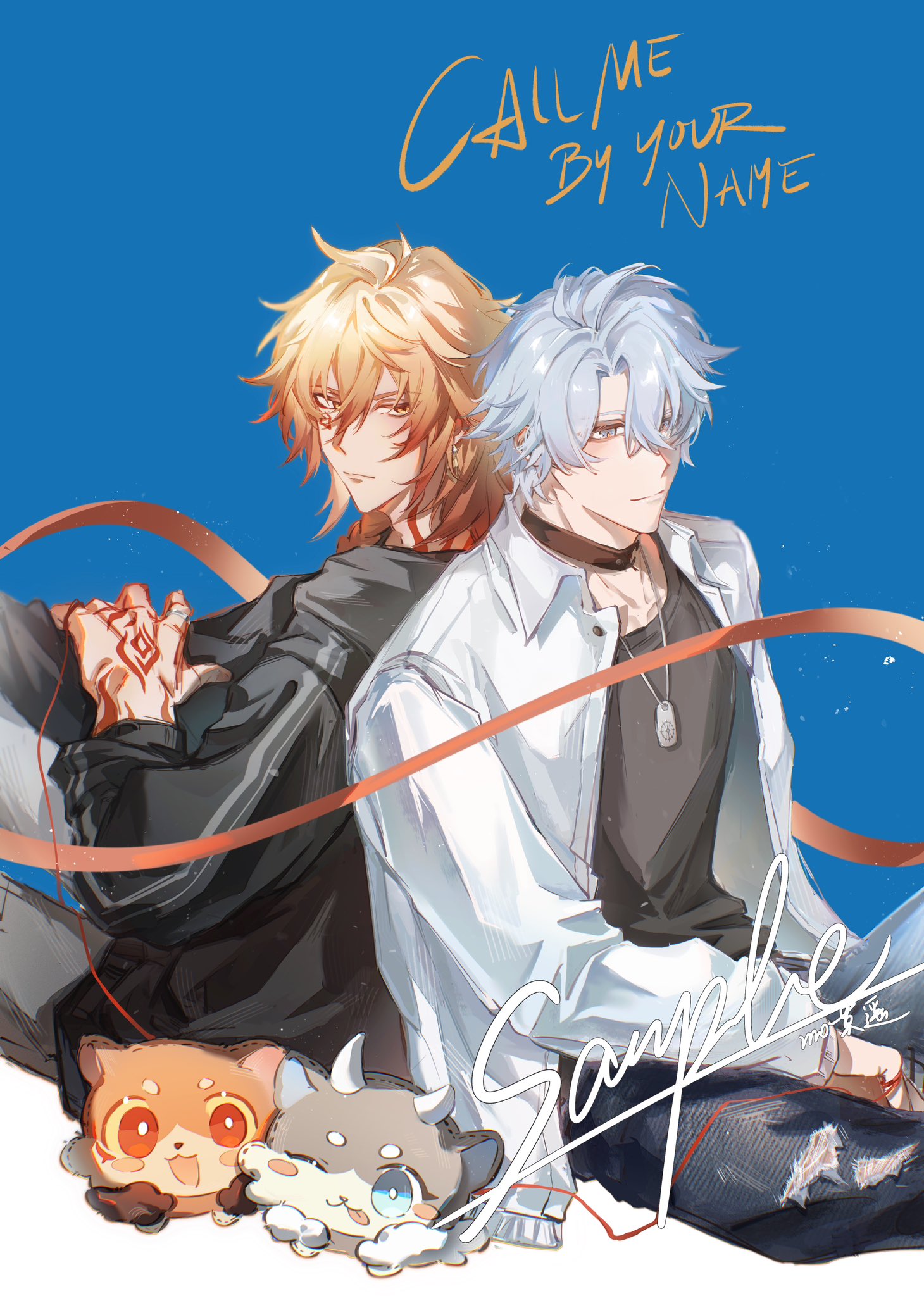 2boys alternate_costume antenna_hair arm_tattoo black_choker black_jacket black_shirt blonde_hair blue_eyes braid chimera_(honkai:_star_rail) choker commentary denim dog_tags facial_tattoo gradient_hair highres honkai:_star_rail honkai_(series) jacket jeans male_focus medium_hair multicolored_hair multiple_boys mydei_(fig_stew)_(honkai:_star_rail) mydei_(honkai:_star_rail) neck_tattoo open_clothes open_jacket pants parted_bangs phainon_(honkai:_star_rail) phainon_(vigethos)_(honkai:_star_rail) red_hair red_tattoo shirt short_hair side_braid untranslatable_commentary tattoo torn_clothes torn_jeans torn_pants white_hair white_jacket yellow_eyes yup6osoeff72033