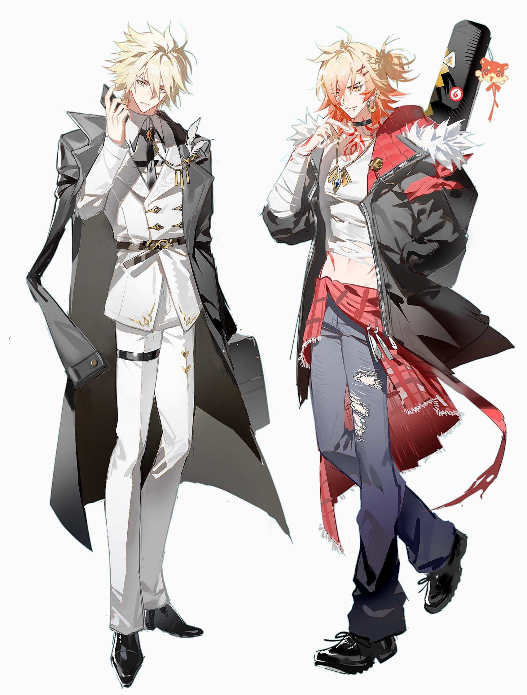 2boys alternate_costume antenna_hair bandaged_arm bandages black_coat black_necktie black_shoes blonde_hair braid charm_(object) chest_tattoo clothes_around_waist coat coat_on_shoulders collared_shirt denim earrings facial_tattoo full_body fur-trimmed_coat fur_trim gold_earrings gold_necklace gradient_hair guitar_case hand_tattoo highres holding holding_phone honkai:_star_rail honkai_(series) instrument_case jacket jeans jewelry male_focus medium_hair multicolored_hair multiple_boys mydei_(fig_stew)_(honkai:_star_rail) mydei_(honkai:_star_rail) necklace necktie pants phainon_(honkai:_star_rail) phainon_(khaslana)_(honkai:_star_rail) phone red_hair red_tattoo shirt shoes side_braid simple_background spiked_hair suirandanshihao tattoo thigh_strap torn_clothes torn_jeans torn_pants torn_shirt white_background white_jacket white_pants white_shirt yellow_eyes