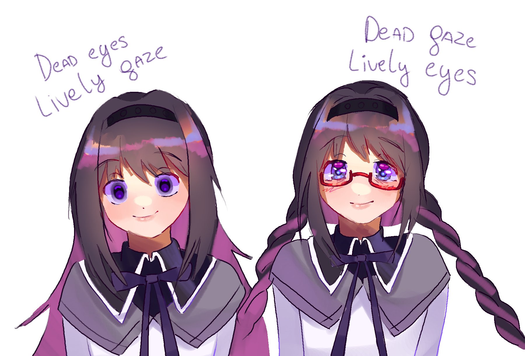 1girl akemi_homura akemi_homura_(magical_girl) black_bow black_collar black_hairband blush bow braid braided_twintails closed_mouth collar commentary dress dress_bow hairband highres keymeyy long_hair looking_at_viewer magical_girl mahou_shoujo_madoka_magica multiple_views purple_eyes red-framed_eyewear sidelocks simple_background smile solo upper_body white_background white_dress