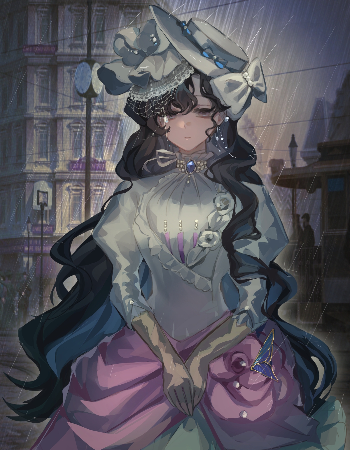 1girl black_hair bow building dress european_architecture gloves half-closed_eyes hat hat_bow hicoua_y highres isolde_(reverse:1999) juliet_sleeves long_hair long_sleeves looking_at_viewer outdoors puffy_sleeves purple_eyes rain reverse:1999 solo tilted_headwear upper_body veil white_bow white_dress white_hat white_veil yellow_gloves