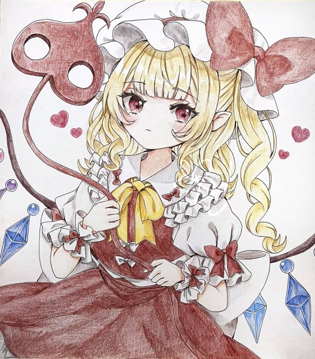 1girl back_bow blonde_hair bow closed_mouth collared_shirt commentary_request crystal crystal_wings flandre_scarlet frilled_shirt_collar frills hat hat_bow heart jaku_sono laevatein_(touhou) looking_at_viewer mob_cap multicolored_wings one_side_up pointy_ears red_bow red_eyes red_skirt red_vest shirt skirt skirt_set sleeve_bow solo touhou traditional_media vest white_bow white_hat wings wrist_cuffs