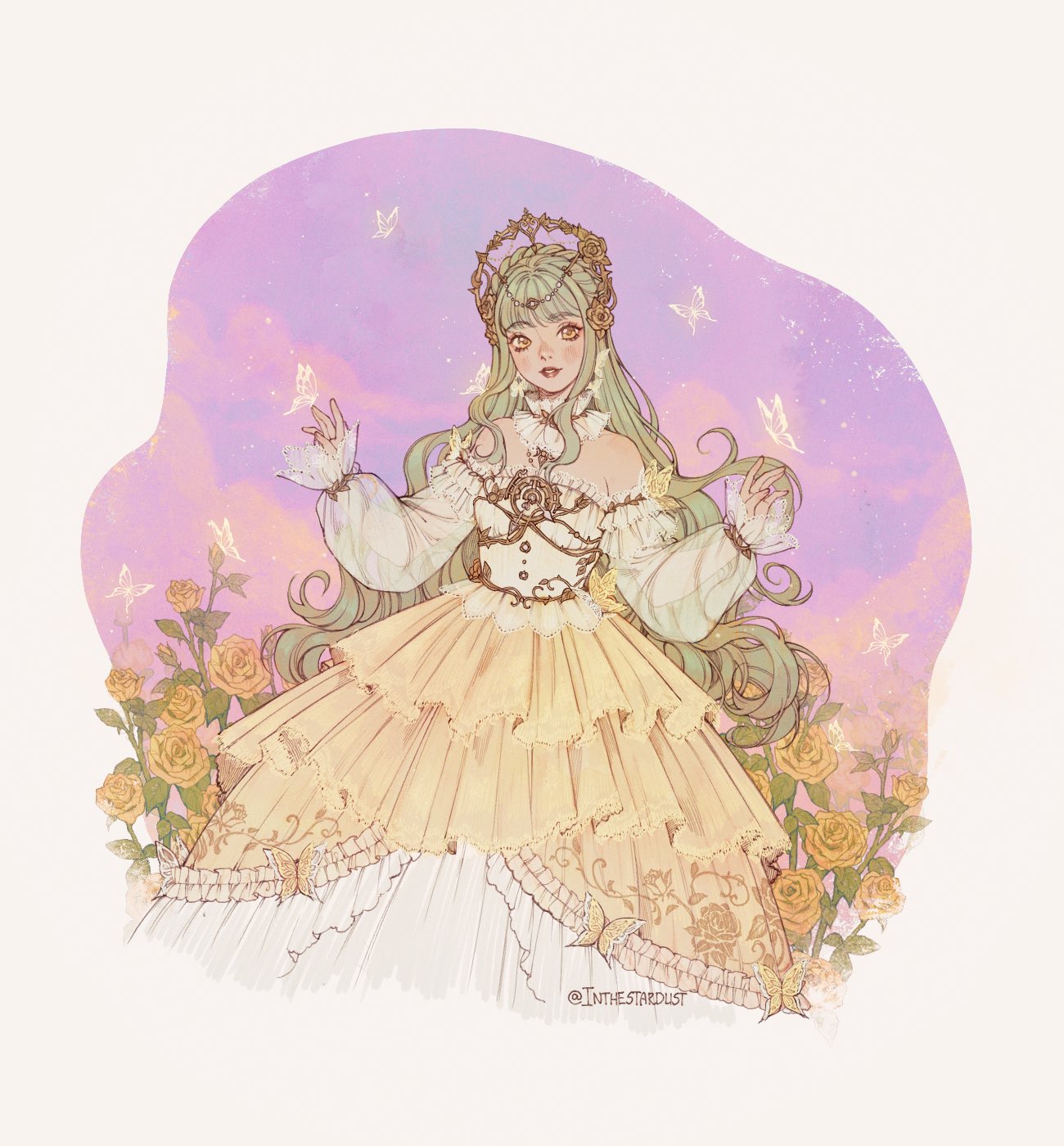 1girl bare_shoulders border bug butterfly butterfly_on_hand circlet cloud collar cropped_legs detached_collar detached_sleeves dress eyelashes flower frilled_dress frilled_sleeves frills gown green_hair halo halo_behind_head happy highres infinity_nikki insect inthestardust lipstick long_hair long_sleeves makeup nikki_(series) outdoors parted_lips puffy_long_sleeves puffy_sleeves purple_sky red_lips rose see-through_clothes see-through_sleeves sky sleeves_past_wrists solo star_(sky) starry_sky strapless strapless_dress sunset twitter_username two-tone_dress very_long_hair wavy_hair white_border white_collar white_dress white_sleeves wishful_aurosa_(infinity_nikki) yellow_dress yellow_eyes yellow_flower yellow_halo yellow_rose