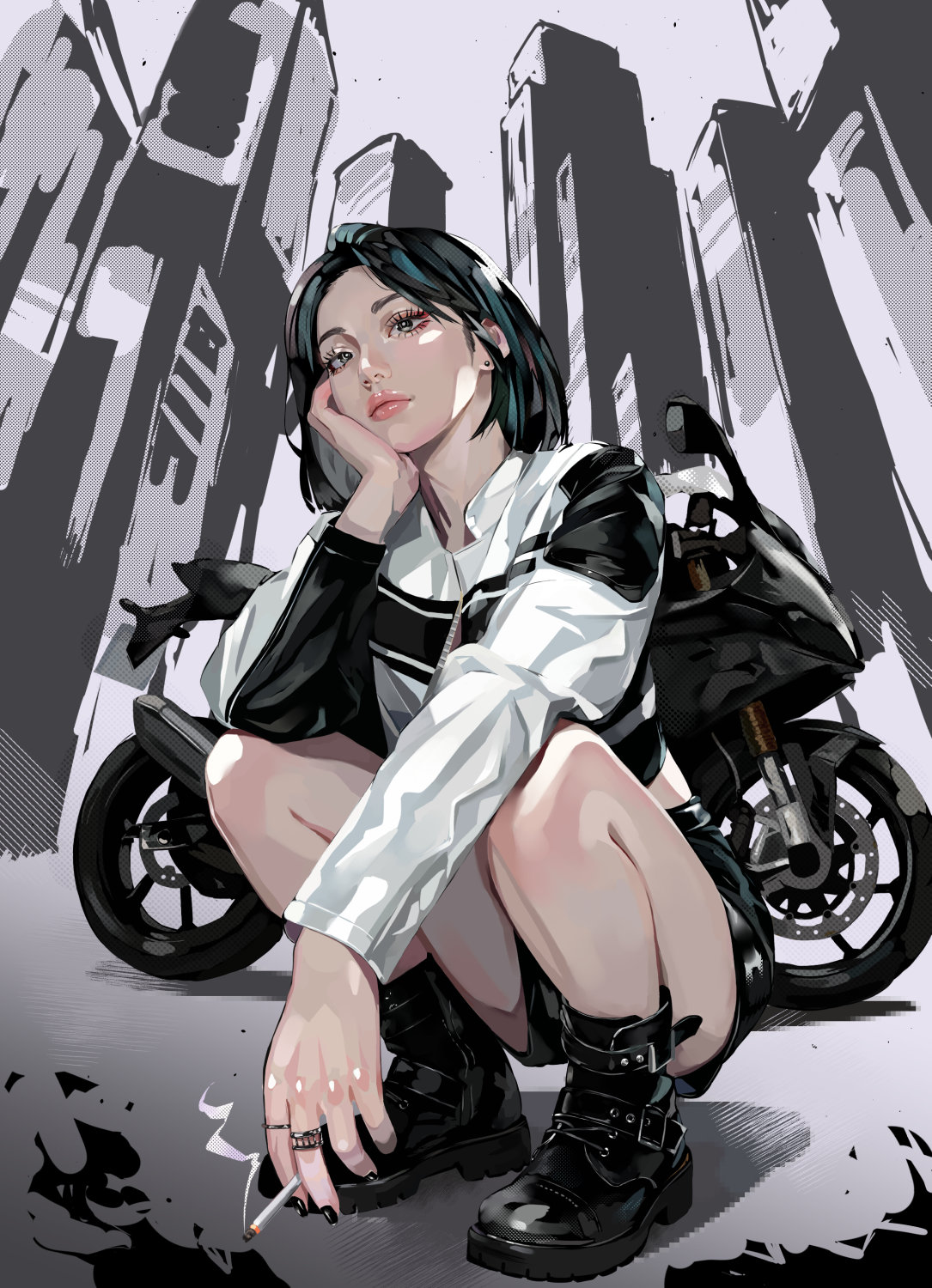 1girl black_eyes black_hair black_shoes black_shorts cigarette cityscape commentary cropped_jacket highres holding holding_cigarette jacket lips looking_at_viewer medium_hair motor_vehicle motorcycle multicolored_jacket original realistic shoes short_shorts shorts solo squatting untranslatable_commentary tor_(torkrub111) two-tone_jacket
