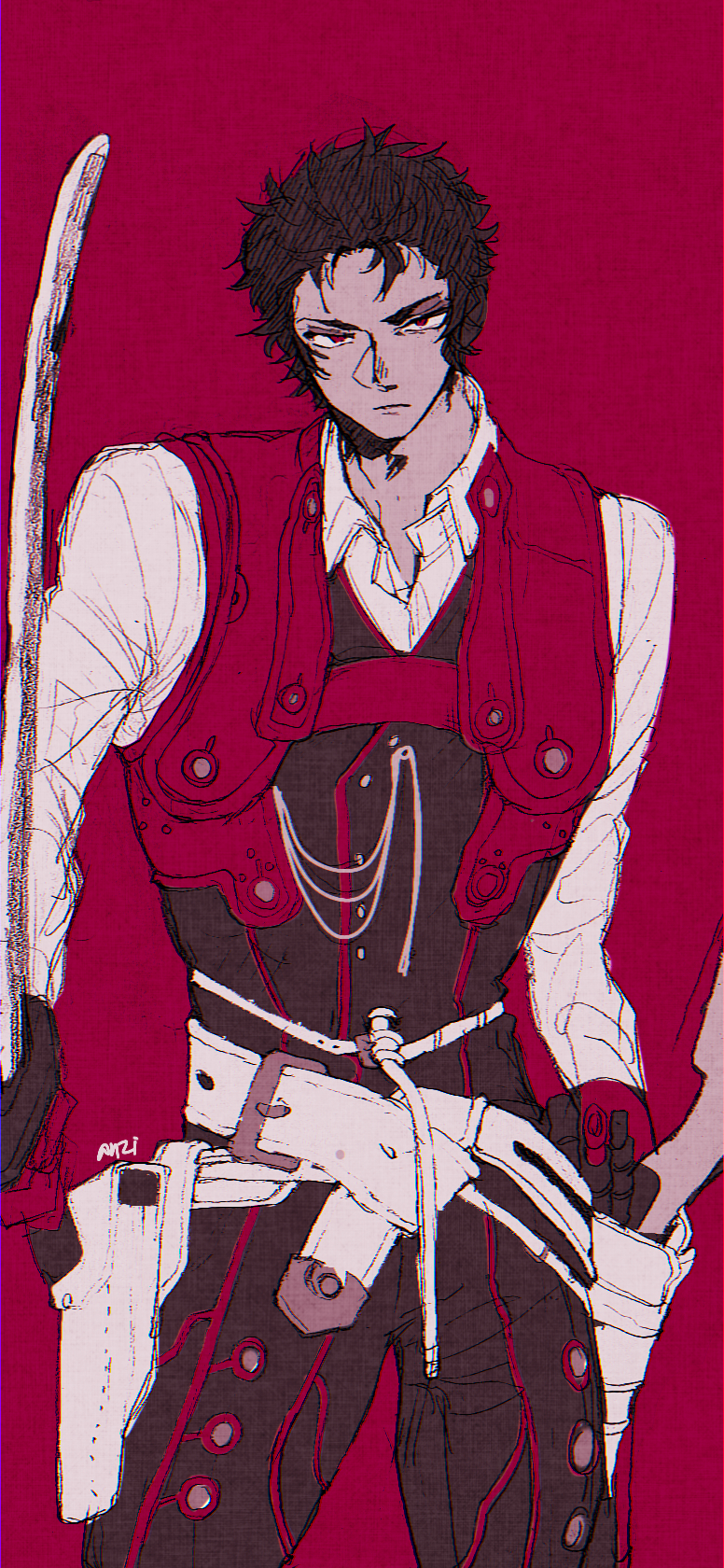 1boy a_nzi_end belt black_hair closed_mouth collared_shirt commentary_request cowboy_shot fate/grand_order fate_(series) highres hijikata_toshizou_(fate) holding holding_sword holding_weapon holster long_sleeves looking_at_viewer male_focus red_background red_eyes red_theme shirt short_hair simple_background solo sword vest weapon