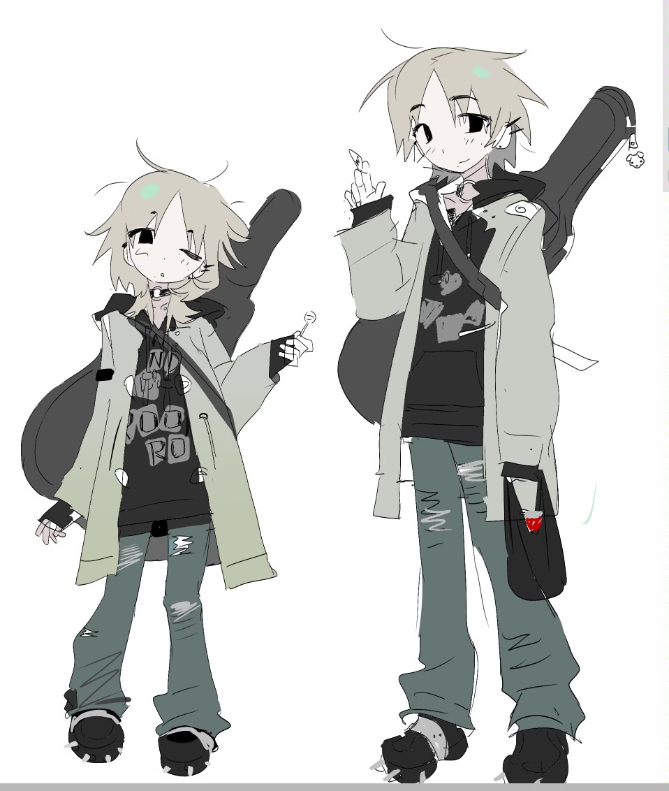 1boy 1girl bag black_choker black_eyes black_shirt blonde_hair candy choker closed_mouth coat commentary_request denim ear_piercing food full_body genderswap green_pants grey_jacket guitar_case holding holding_bag hood hood_down hoodie instrument_case jacket jeans lollipop long_sleeves looking_at_viewer mk1liaoqian one_eye_closed open_clothes open_jacket original pants piercing platform_shoes plectrum print_shirt shirt shoes short_hair simple_background sketch sleeves_past_wrists smile standing torn_clothes torn_jeans torn_pants white_background