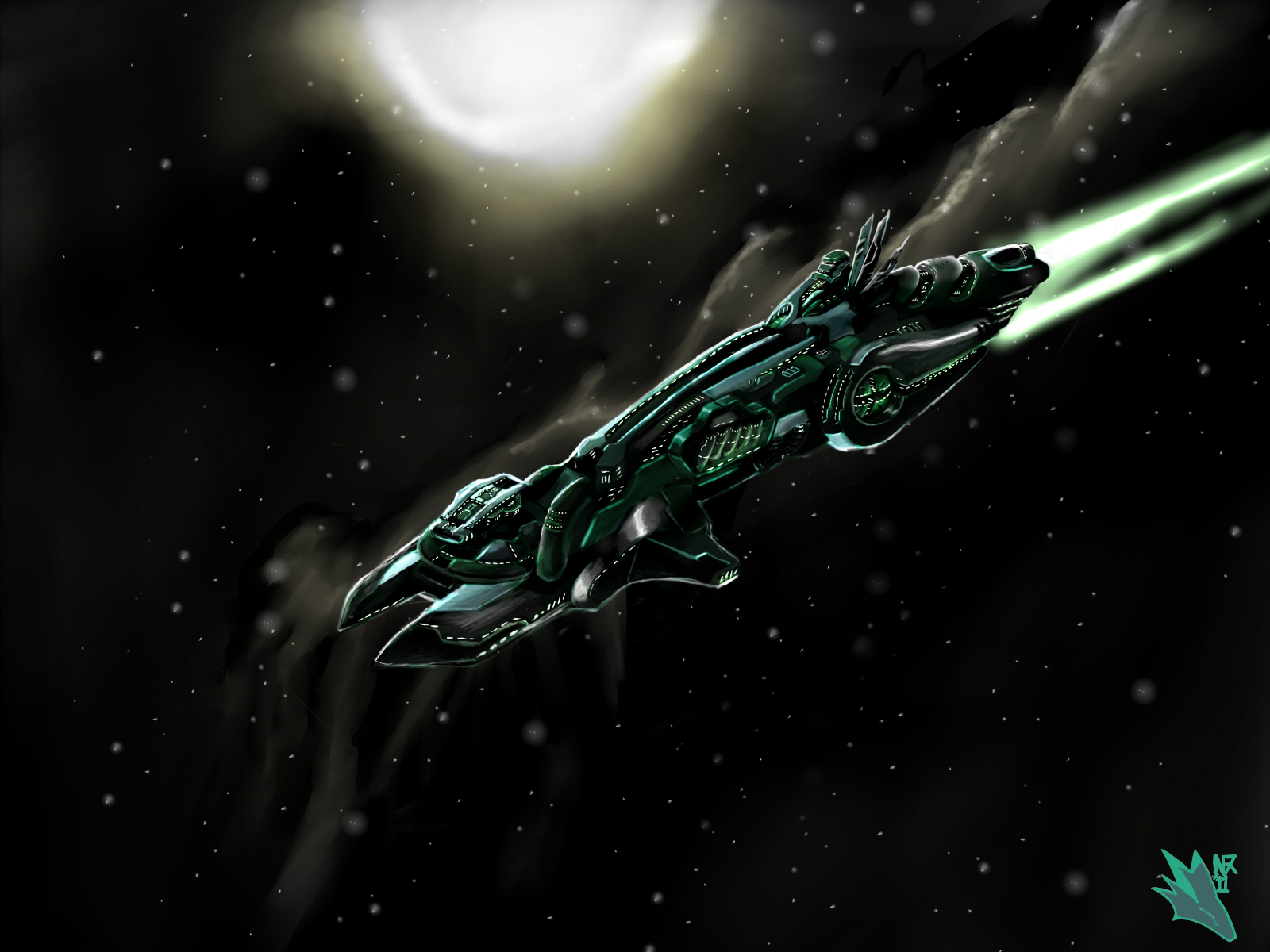 advanced_ship_(eve_online) artist_logo battleship_(eve_online) commentary concept_art dark_background english_commentary eve_online flying gallente_federation_(eve_online) glowing highres logo novafox original outdoors space spacecraft star_(sky) starry_sky_background vehicle_focus