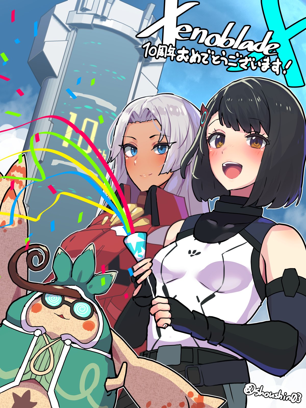 2girls black_hair boris_(noborhys) elma_(xenoblade_x) glasses gloves grey_hair hair_ornament lin_lee_koo long_hair multiple_girls party_popper short_hair tatsu_(xenoblade_x) xenoblade_chronicles_(series) xenoblade_chronicles_x