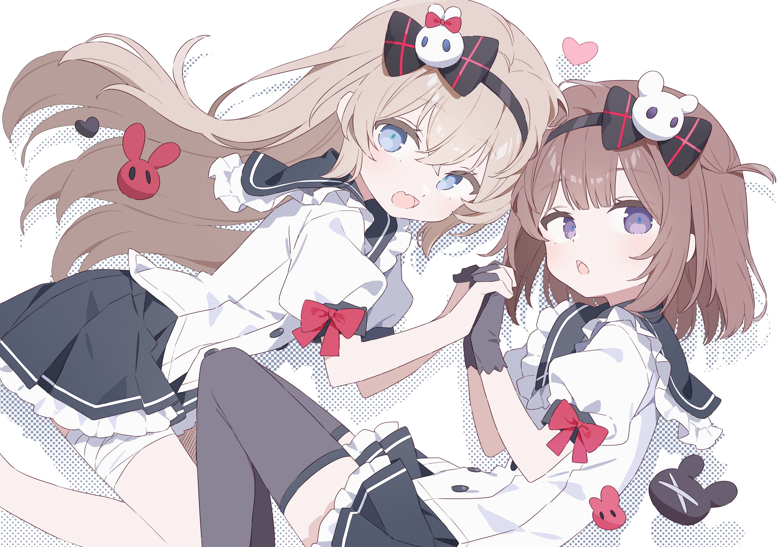 2girls :d :o bandaged_leg bandages black_gloves black_hairband black_sailor_collar black_skirt black_thighhighs blue_eyes blush bow bow_hairband brown_hair commentary_request commission fang feet_out_of_frame frilled_sailor_collar frilled_skirt frills gloves hairband heart highres holding_hands interlocked_fingers long_hair looking_at_viewer multiple_girls open_mouth original pleated_skirt purple_eyes red_bow sailor_collar school_uniform serafuku shirt short_hair short_sleeves simple_background skeb_commission skin_fang skirt sleeve_bow smile thighhighs urotsuki_(ku9625) white_background white_shirt zettai_ryouiki