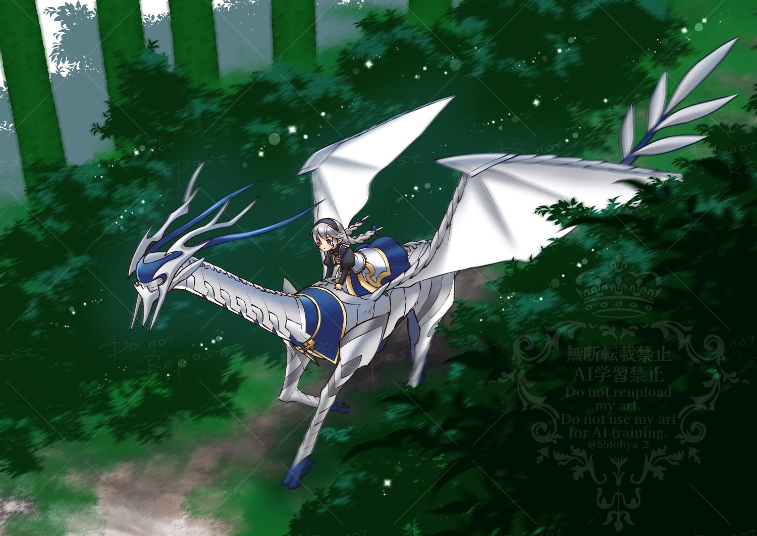 1girl 1other aged_down black_hairband braid braided_twintails commentary_request corrin_(dragon)_(fire_emblem) female_corrin_(fire_emblem) female_corrin_(young_kinship)_(fire_emblem) fire_emblem fire_emblem_fates fire_emblem_heroes grey_hair hair_between_eyes hairband horseback_riding long_hair nintendo official_alternate_costume pointy_ears red_eyes riding touya_(55tohya)