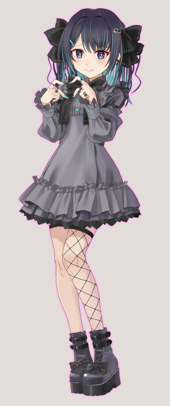 1girl aqua_hair black_hair blue_eyes bow commentary_request dress fishnet_thighhighs fishnets frilled_dress frills full_body grey_background grey_dress hair_bow heart heart_hands highres jirai_kei katahira_masashi long_hair looking_at_viewer multicolored_hair original platform_shoes shoes simple_background single_thighhigh smile solo thighhighs two-tone_hair