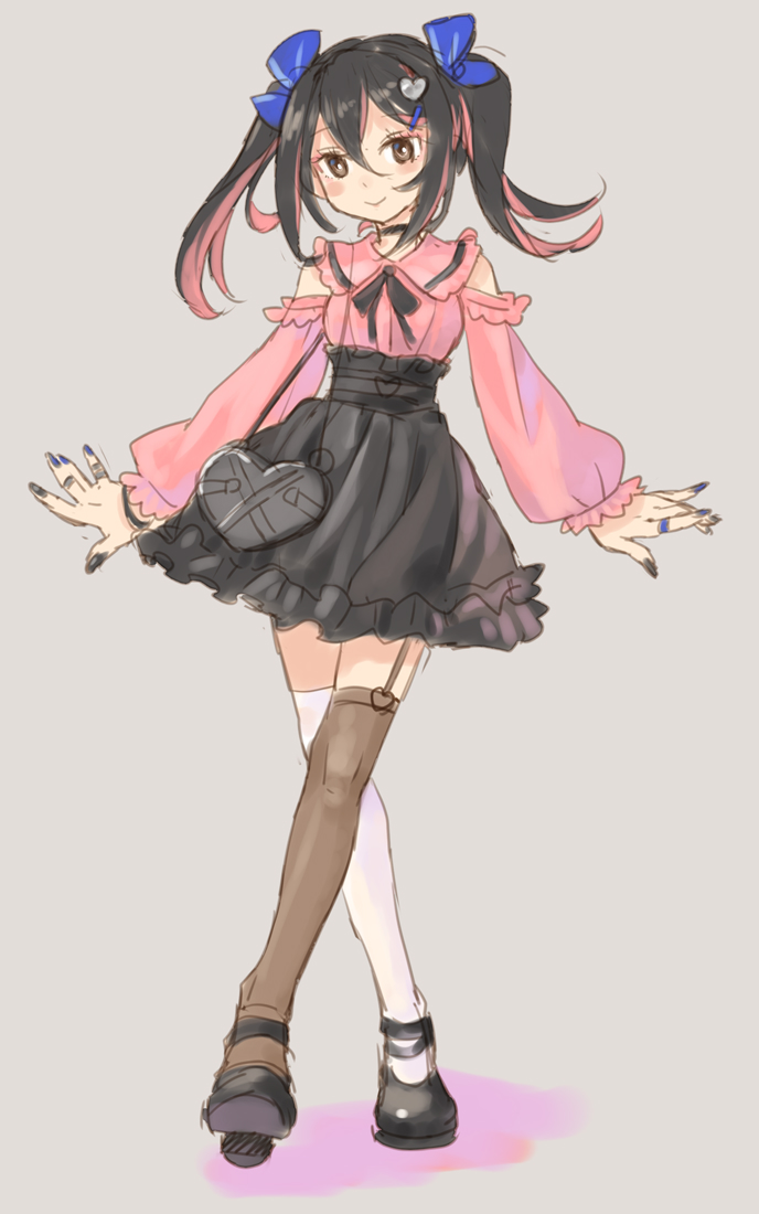 1girl black_hair black_nails brown_eyes commentary_request crossed_legs fingernails full_body high-waist_skirt jirai_kei katahira_masashi long_fingernails long_hair looking_at_viewer mismatched_thighhighs multicolored_hair original pink_eyes sketch skirt smile solo thighhighs twintails two-tone_hair