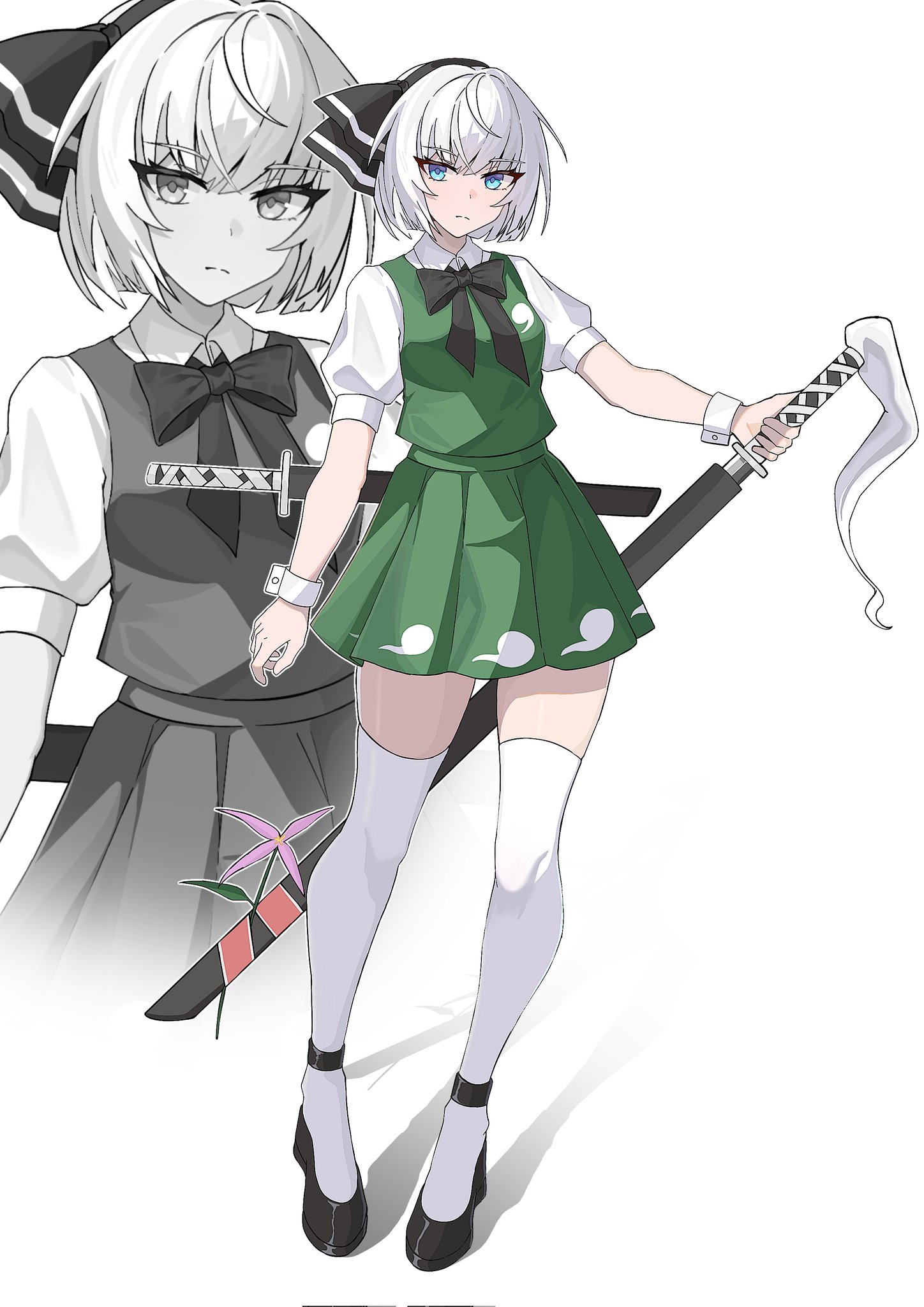 1girl black_hairband black_shoes blue_eyes collared_shirt corrupted_twitter_file full_body green_skirt green_vest hairband hashtag-only_commentary highres holding holding_sword holding_weapon katana konpaku_youmu miniskirt pleated_skirt puffy_short_sleeves puffy_sleeves sheath sheathed shirt shoes short_hair short_sleeves skirt solo sword thighhighs touhou vest wakizashi weapon white_background white_hair white_shirt white_thighhighs wraithakari zettai_ryouiki zoom_layer