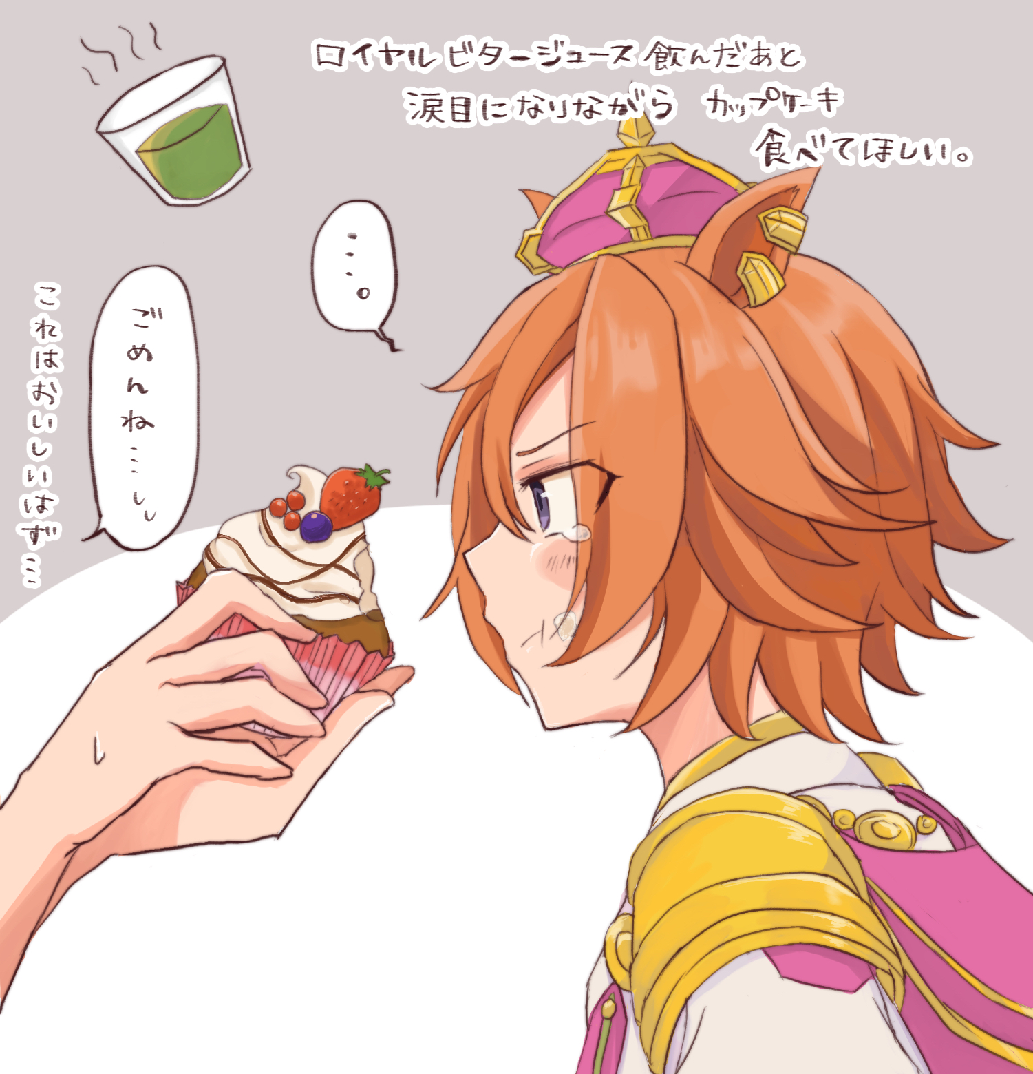 ... 1girl 1other blush_stickers closed_mouth commentary_request crown cup cupcake drinking_glass eating feeding food food_on_face from_side fruit grey_background hair_between_eyes highres holding holding_food mini_crown orange_hair profile purple_eyes royal_bitter_juice shirt spoken_ellipsis strawberry t.m._opera_o_(o_sole_suo!)_(umamusume) t.m._opera_o_(umamusume) tears translation_request two-tone_background umamusume upper_body usako_(umauma0602) white_background white_shirt