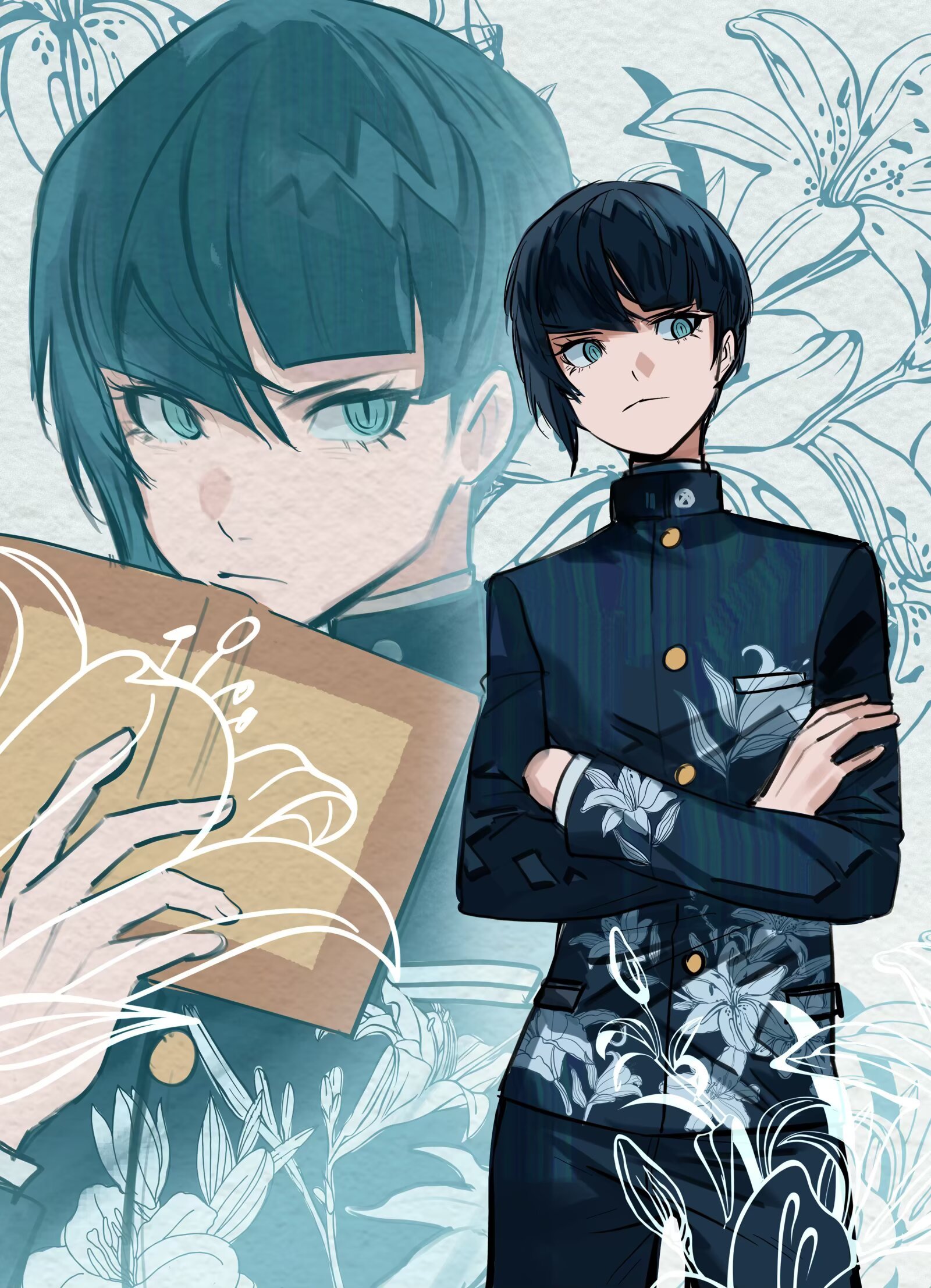 1boy black_hair book buttons crossed_arms floral_print_jacket gakuran green_eyes highres holding holding_book jouin_high_school_uniform laishamark92077 long_sleeves male_focus open_book protagonist_(smtv) protagonist_(student)_(smtv) school_uniform shin_megami_tensei shin_megami_tensei_v short_hair solo
