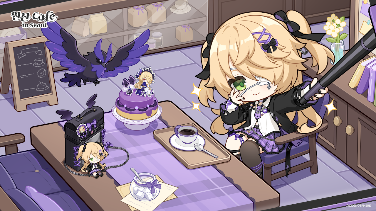 1girl asymmetrical_legwear bird black_jacket black_thighhighs blonde_hair cake chair character_doll chibi chibi_only closed_mouth doll eyepatch fischl_(ein_immernachtstraum)_(genshin_impact) fischl_(genshin_cafe_in_seoul)_(genshin_impact) fischl_(genshin_impact) food genshin_impact green_eyes holding indoors jacket long_hair long_sleeves necktie official_art on_chair open_clothes open_jacket oz_(genshin_impact) purple_necktie purple_skirt shirt sitting skirt smile thighhighs uneven_legwear white_shirt