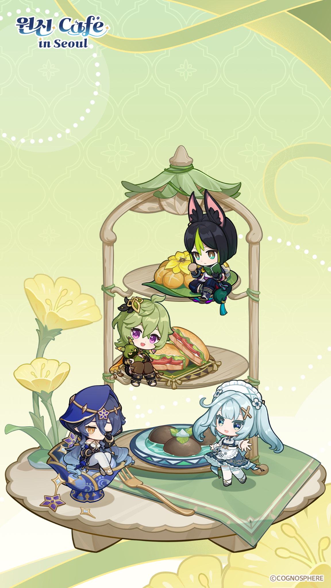1boy 3girls aqua_eyes aqua_hair blue_hair brown_thighhighs chibi chibi_only collei_(genshin_impact) cuilein-anbar_(genshin_impact) faruzan_(genshin_cafe_in_seoul)_(genshin_impact) faruzan_(genshin_impact) food genshin_impact green_hair hair_ornament highres layla_(genshin_impact) long_hair long_sleeves looking_at_viewer multiple_girls official_alternate_costume official_art official_wallpaper open_mouth panties pointy_ears purple_eyes sitting smile standing thighhighs tighnari_(genshin_impact) underwear white_panties white_thighhighs x_hair_ornament yellow_eyes