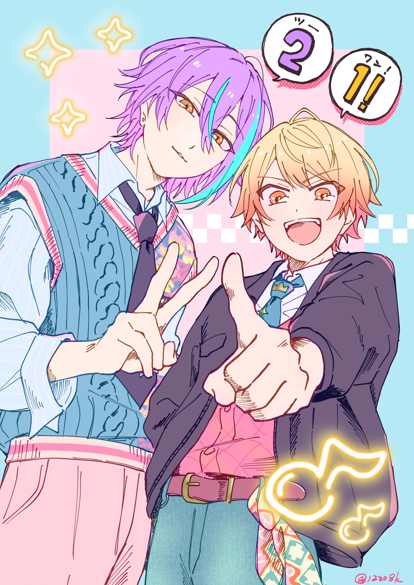 12zobk 2boys black_necktie blonde_hair blue_necktie commentary_request earrings from_below head_tilt highres jacket jewelry kamishiro_rui long_sleeves male_focus multiple_boys necktie open_clothes open_jacket open_mouth project_sekai purple_hair single_earring sparkle tenma_tsukasa v yellow_eyes
