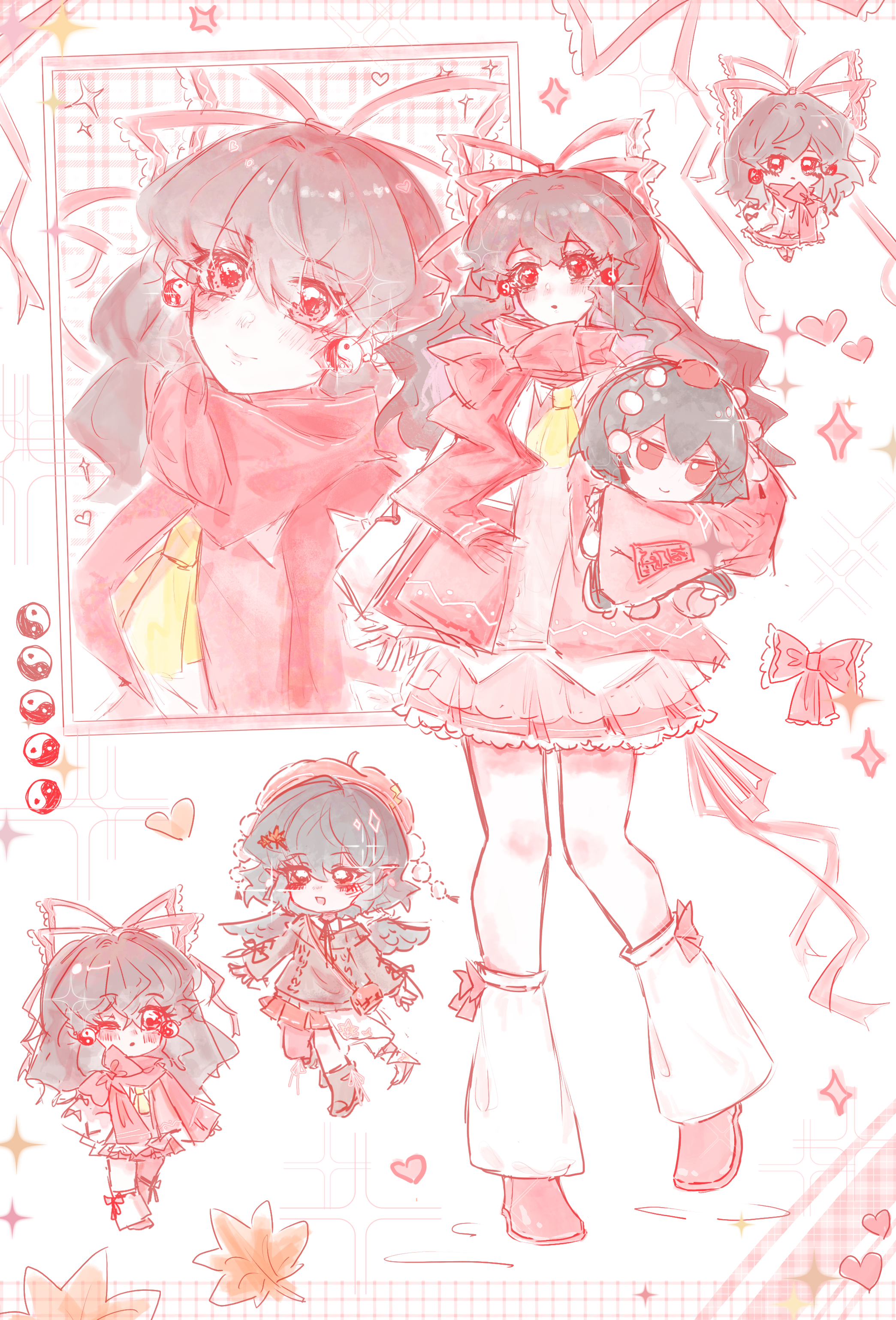 2girls absurdres alternate_costume ascot bag black_boots black_sweater blush boots brown_hair character_doll closed_mouth commentary doll fumo_(doll) hair_ribbon hakurei_reimu heart highres huai_qiong_feng_ling_mian leg_warmers long_hair long_sleeves looking_at_viewer multiple_girls one_eye_closed open_mouth pointy_ears pom_pom_(clothes) red_eyes red_ribbon red_scarf red_shoes red_skirt ribbon scarf shameimaru_aya shoes shoulder_bag skirt smile sweater touhou white_leg_warmers yellow_ascot yin_yang_hair_ornament