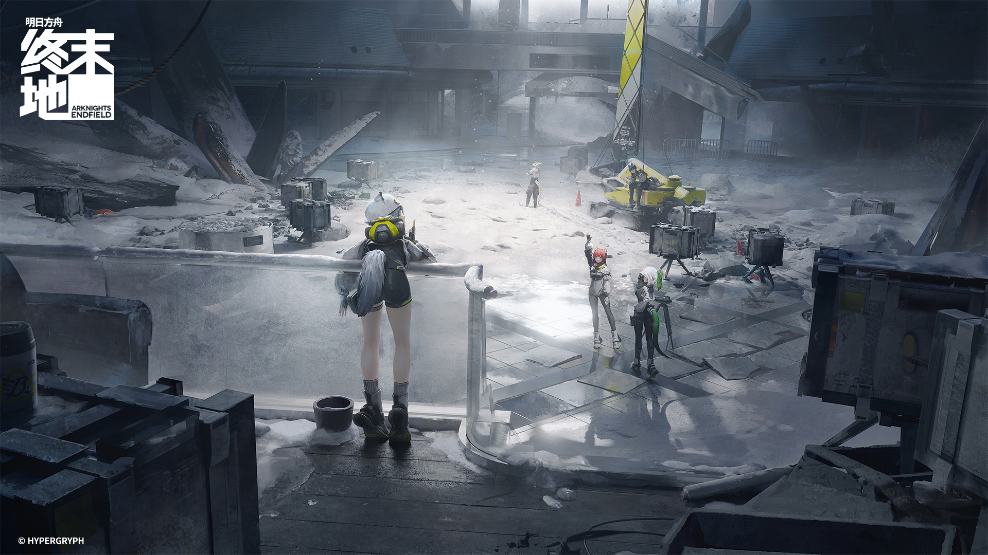 1boy 3girls akekuri_(arknights) animal_ears architecture arknights arknights:_endfield chinese_commentary commentary_request crocodile_girl crocodilian_tail dog_ears dog_girl dog_tail estella_(arknights) fluorite_(arknights) green_hair high_ponytail highres logo mamako(_mamako) medium_hair multiple_girls official_art ponytail red_hair reptile_boy short_hair tail