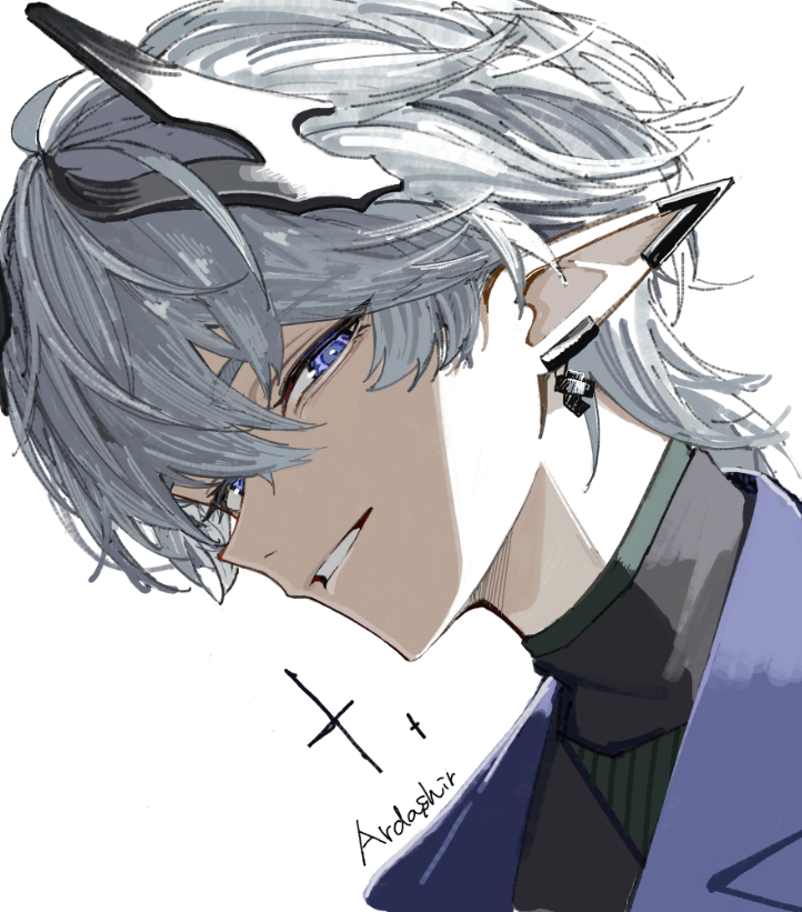 1boy ardashir_(arknights) arknights arknights:_endfield black_shirt character_name commentary earrings grin hair_between_eyes half-closed_eyes jewelry looking_at_viewer male_focus pointy_ears portrait purple_eyes rotroto shirt short_hair simple_background smile solo turtleneck turtleneck_shirt white_background white_hair