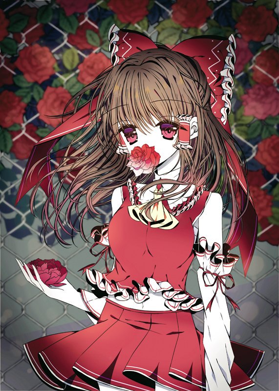 1girl arm_at_side ascot bare_shoulders bow breasts brown_hair chain-link_fence commentary_request cowboy_shot detached_sleeves fence flower flower_in_mouth frilled_bow frilled_hair_tubes frilled_shirt_collar frills hair_bow hair_tubes hakurei_reimu holding holding_flower long_hair long_sleeves medium_breasts midriff_peek miniskirt mouth_hold navel pleated_skirt red_bow red_eyes red_flower red_ribbon red_rose red_skirt ribbon rimei rose skirt sleeve_ribbon solo standing touhou white_sleeves yellow_ascot