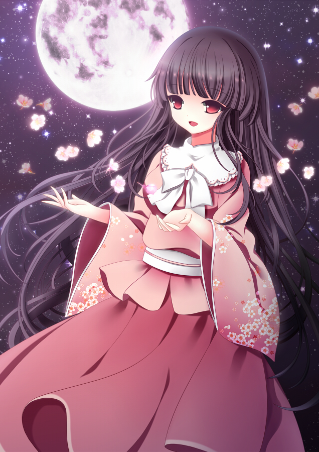 1girl :d black_hair blunt_bangs bow bowtie commentary_request cowboy_shot falling_petals floral_print_shirt full_moon houraisan_kaguya long_hair long_sleeves moon night open_hands open_mouth petals pink_petals pink_shirt red_eyes red_skirt rimei shirt skirt sky smile solo standing star_(sky) starry_sky touhou very_long_hair white_bow white_bowtie wide_sleeves