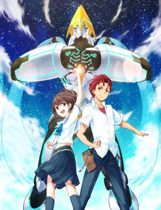 1boy 1girl artist_request blue_pants blue_socks brown_eyes brown_hair chest_bow chuo_tanegashima_high_school_uniform cloud gunvarrel kidou_battle_gunvarrel kneehighs long_hair mecha midriff_peek navel official_art open_mouth pants pleated_skirt robot robotics;notes school_uniform science_adventure senomiya_akiho skirt sky smile socks star_(sky) starry_sky summer_uniform yashio_kaito