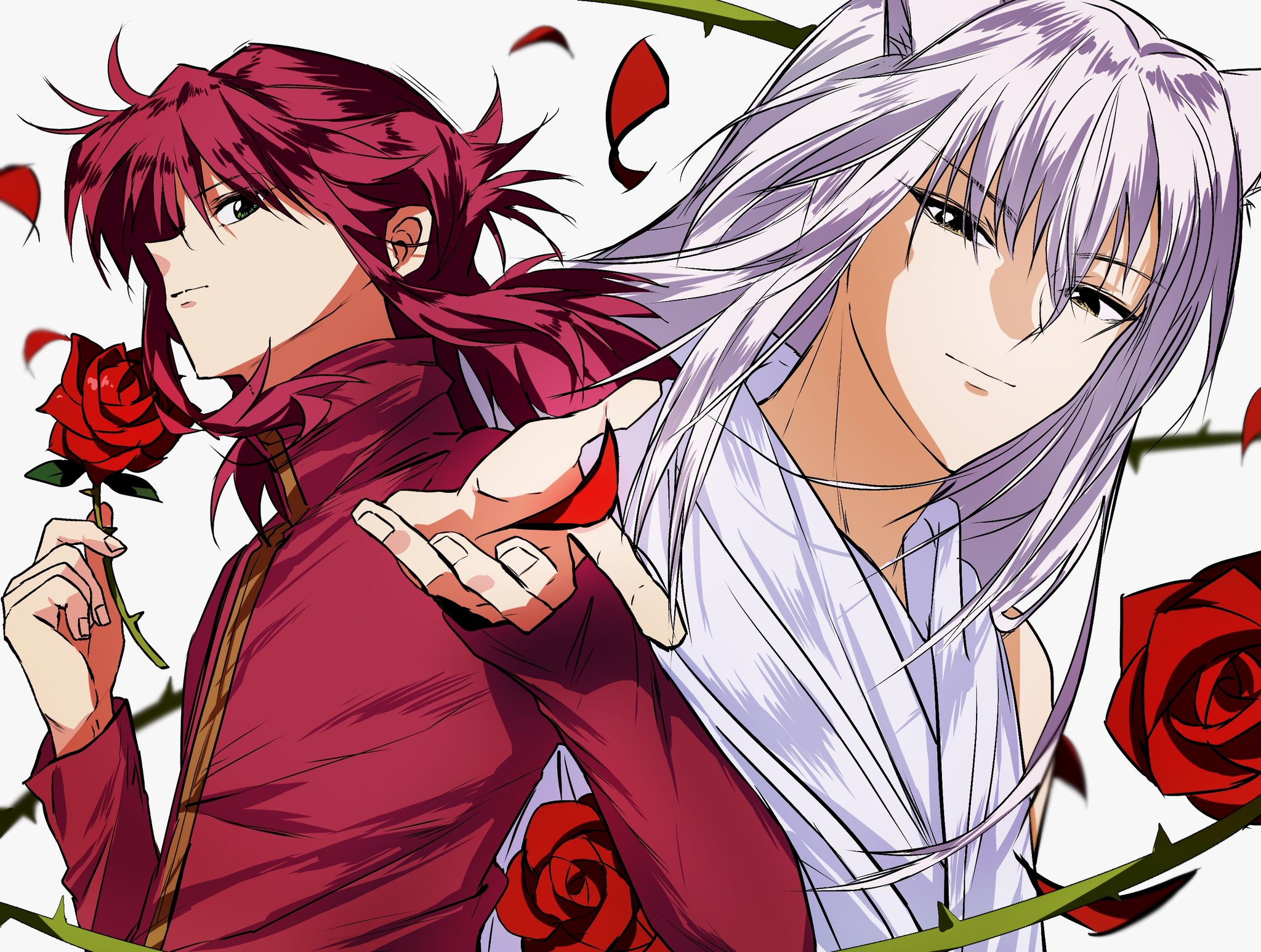 2boys alternate_form animal_ears arms_up black_eyes closed_mouth commentary_request falling_petals floating_hair flower fox_boy fox_ears highres holding holding_flower jacket korean_commentary kurama_(yu_yu_hakusho) long_sleeves looking_to_the_side male_focus multiple_boys petals plant red_flower red_hair red_jacket red_rose rose shirt smile thorns ultomato523548 vines white_background white_shirt youko_kurama yuu_yuu_hakusho