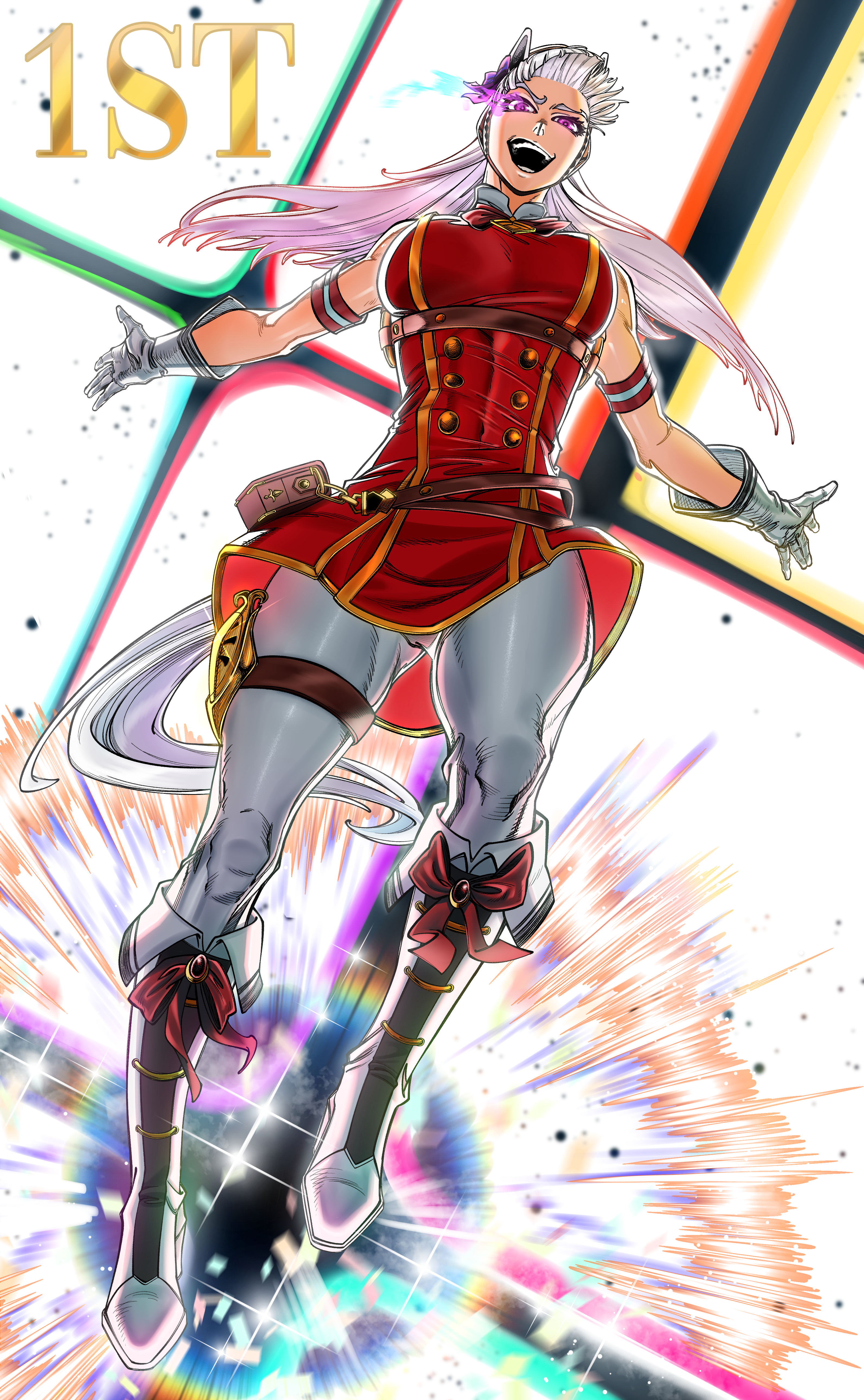 1girl :d absurdres animal_ears armband bad_tag belt belt_pouch boots breasts brown_belt buttons commentary double-breasted dress dutch_angle eye_trail floating floating_hair full_body gloves gold_ship_(red_strife)_(umamusume) gold_ship_(umamusume) highres horse_ears horse_girl horse_tail im_2074 knee_boots large_breasts light_trail long_hair looking_at_viewer meme open_mouth pantyhose pillbox_hat pouch purple_eyes red_armband red_dress sleeveless sleeveless_dress smile solo tail thigh_strap umamusume wally_west_solos_fiction_(meme) white_background white_boots white_gloves white_hair white_pantyhose white_tail
