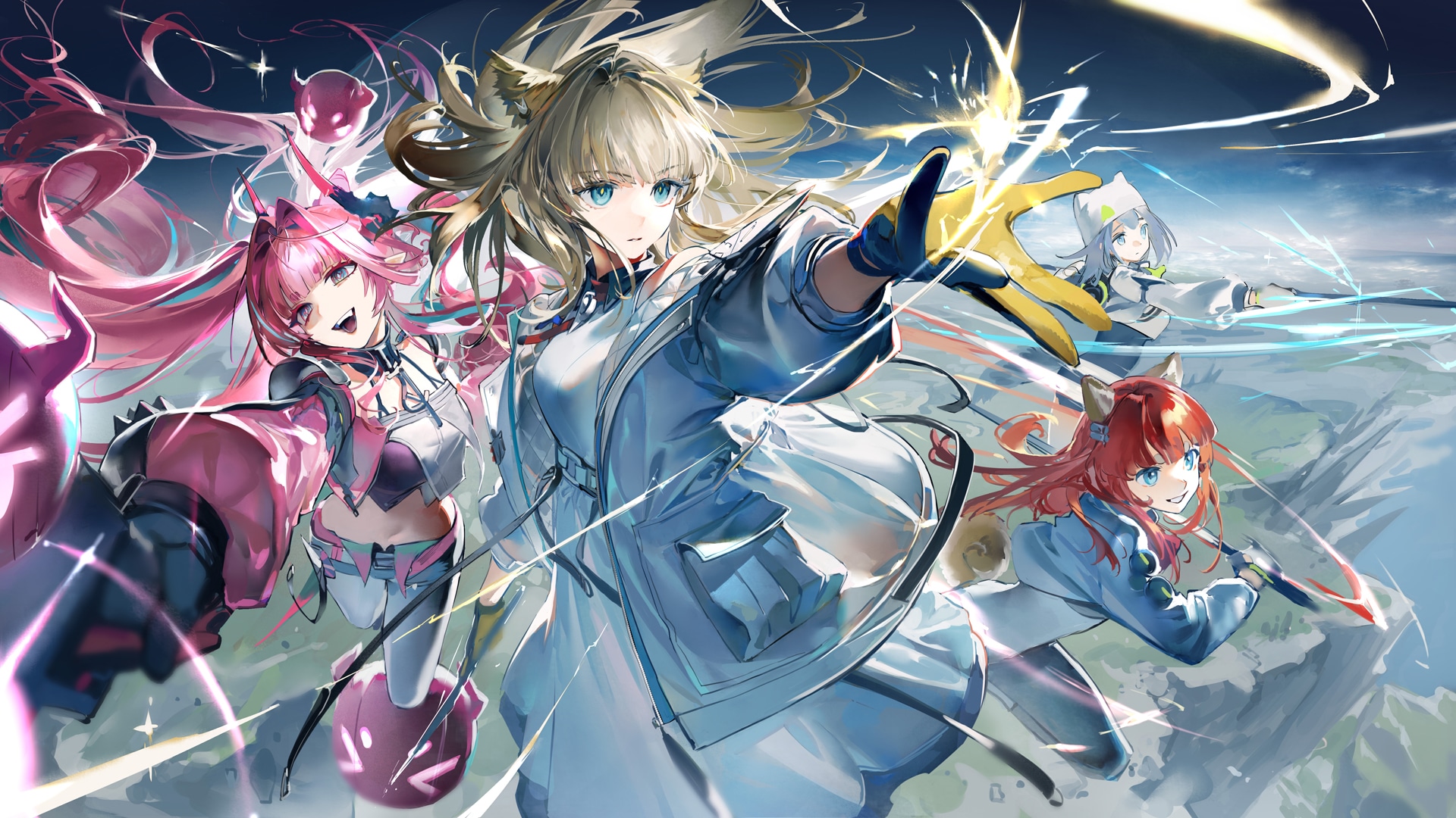 4girls akekuri_(arknights) animal_ears animal_hat arknights arknights:_endfield bird_ears bird_girl blue_eyes brown_hair cat_hat cat_tail dog_girl dog_tail dress estella_(arknights) floating_hair grey_hair grin hair_intakes hat highres holding holding_sword holding_weapon jacket midriff multiple_girls official_art open_clothes open_jacket outdoors pants perlica_(arknights) pink_hair pointy_ears red_hair ruint second-party_source smile sword tail two-sided_gloves weapon white_dress white_hat white_pants yvonne_(arknights)