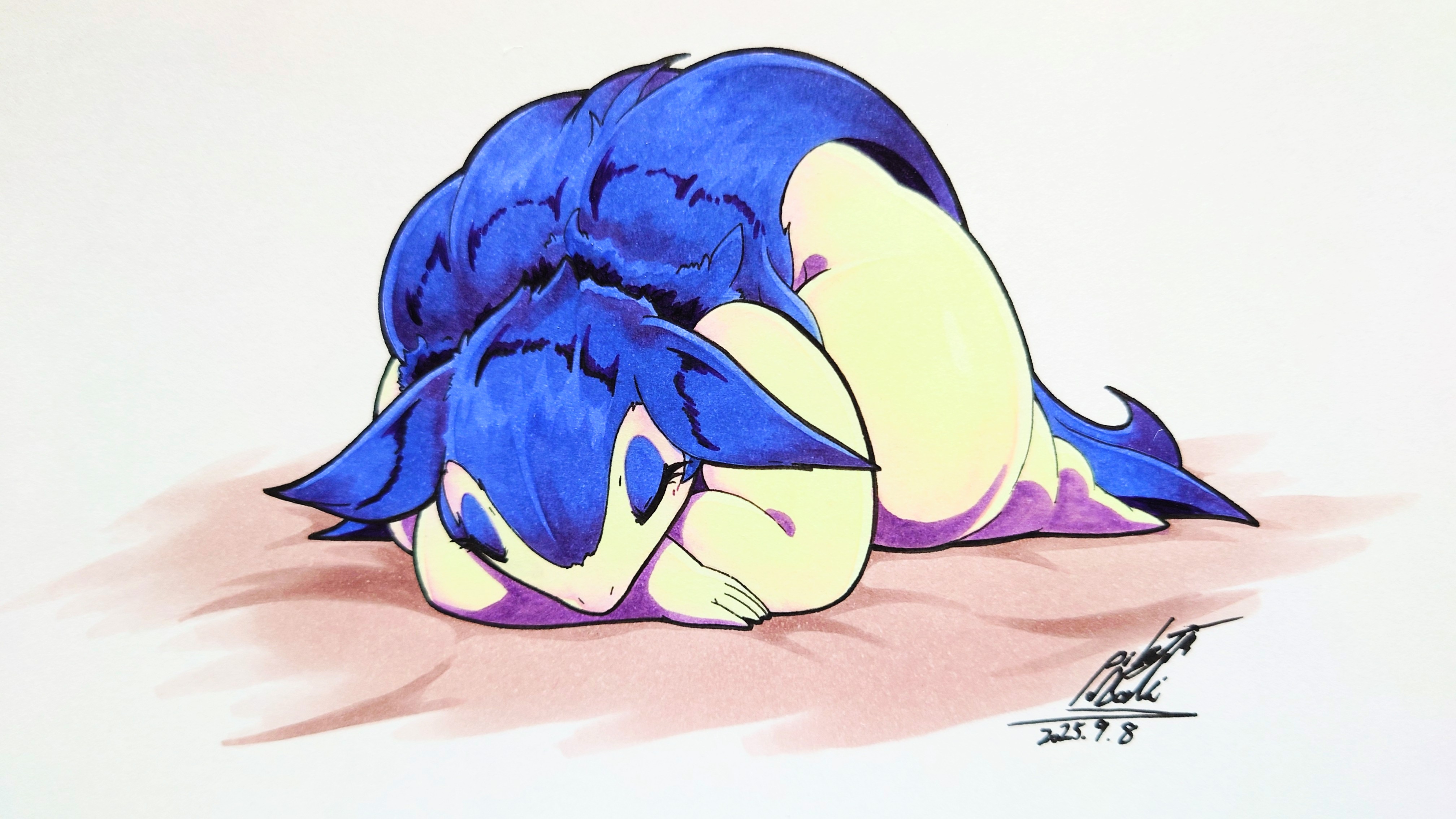 025aki absurdres blue_fur closed_eyes commentary_request dated gen_2_pokemon highres nintendo no_humans pokemon pokemon_(creature) signature sleeping solo two-tone_fur typhlosion yellow_fur