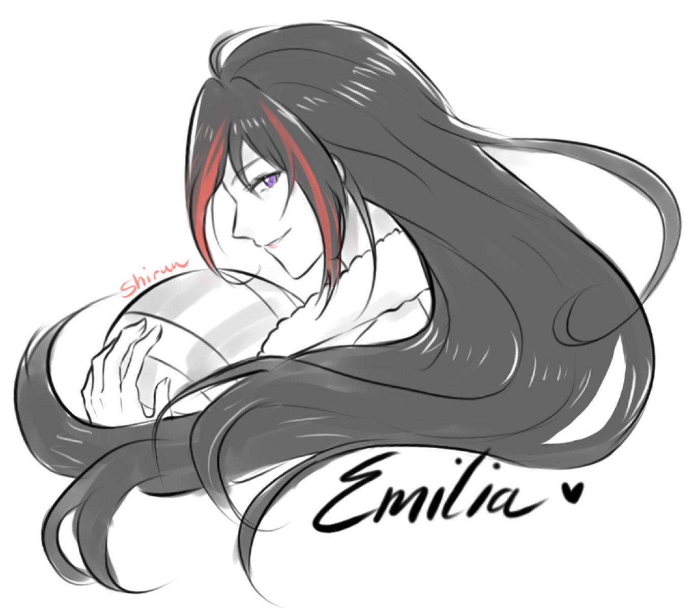 1girl ahoge artist_name black_hair character_name closed_mouth commentary eiyuu_densetsu emilia_harling english_commentary english_text from_behind fur_collar hair_between_eyes heart helmet holding holding_unworn_helmet kai_no_kiseki kuro_no_kiseki_(series) limited_palette long_hair looking_at_viewer multicolored_hair parted_bangs purple_eyes red_hair shiruuruu simple_background smile solo streaked_hair two-tone_hair unworn_headwear unworn_helmet white_background