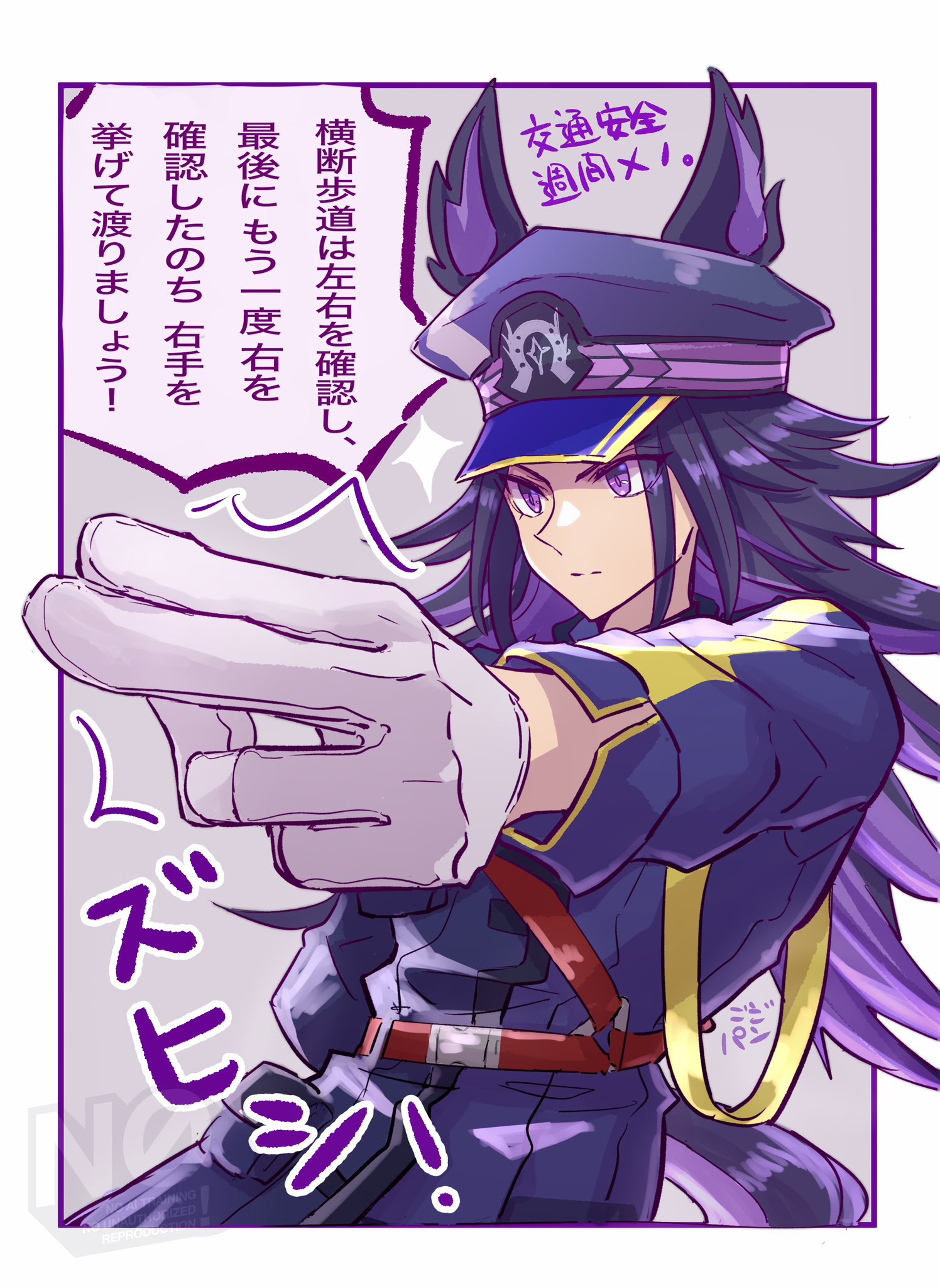 1girl animal_ears black_hair black_jacket closed_mouth commentary_request ears_through_headwear fenomeno_(black_flames_of_the_righteous_spirit)_(umamusume) fenomeno_(umamusume) flipped_hair gloves gogono_pan'ya hat highres horse_ears horse_girl horse_tail horseshoe_hat_ornament horseshoe_ornament jacket long_hair long_sleeves multicolored_hair peaked_cap purple_eyes purple_hair sparkle speech_bubble tail umamusume white_gloves
