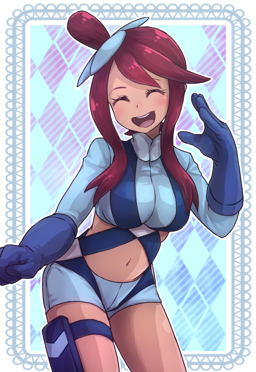 1girl blue_gloves blue_jacket blue_shorts breasts closed_eyes cropped_jacket female_focus gloves jacket kotobukkii_(yt_lvlv) large_breasts navel nintendo open_mouth pokemon pokemon_bw red_hair short_hair short_hair_with_long_locks shorts skyla_(pokemon) smile solo teeth upper_teeth_only
