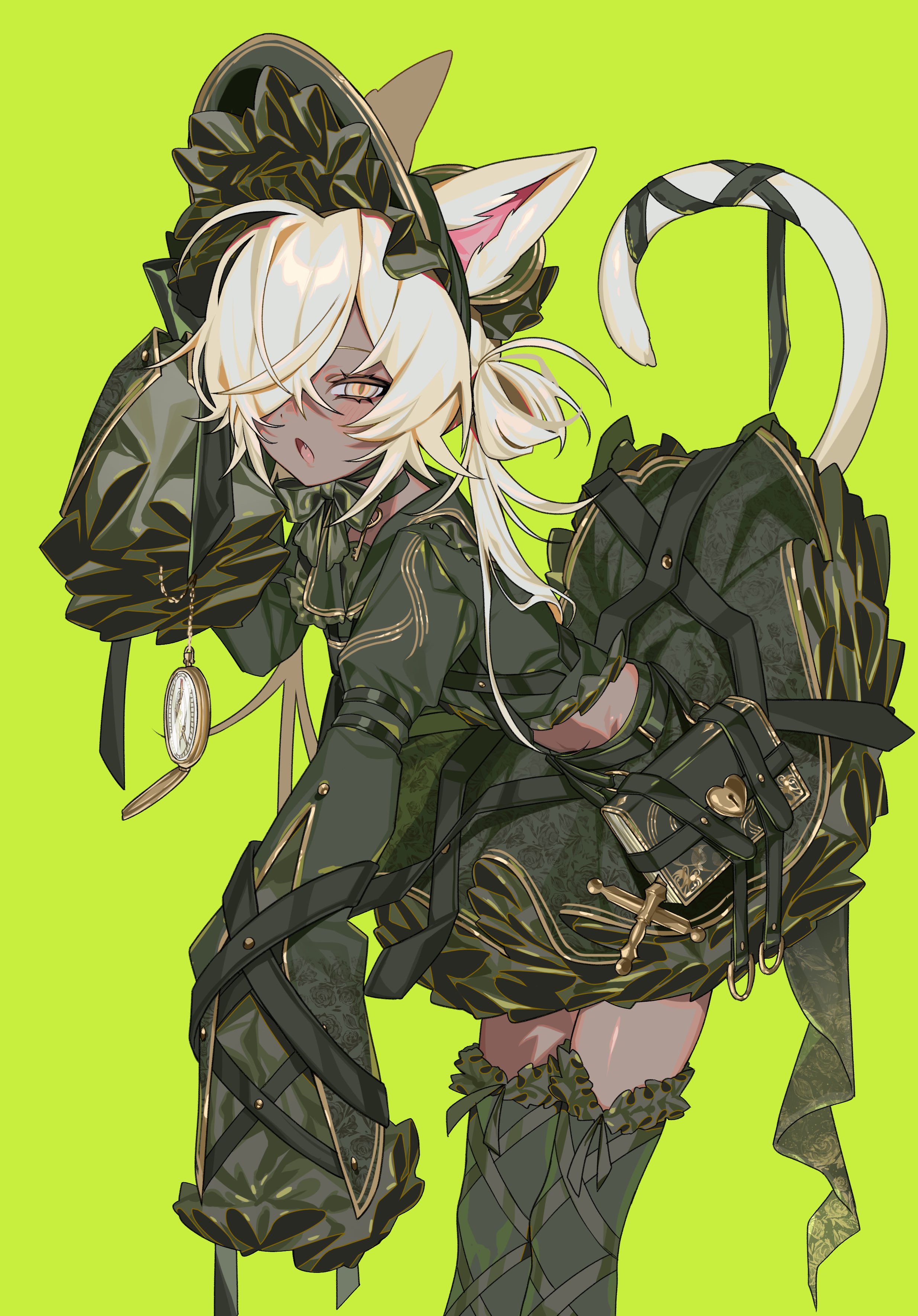 1girl :o absurdres animal_ear_fluff animal_ears antenna_hair asymmetrical_bangs bent_over black_hat black_serafuku black_skirt black_thighhighs blonde_hair cat_ears cat_girl cat_tail commentary_request dark-skinned_female dark_skin fang flat_chest frilled_skirt frills gothic_lolita green_background hair_over_one_eye hamita_(rikopin_ika) hand_up hat highres holding holding_pocket_watch lolita_fashion long_sleeves looking_at_viewer messy_hair original pocket_watch ribbon-trimmed_thighhighs ribbon_trim school_uniform serafuku side_ponytail simple_background skirt sleeves_past_fingers sleeves_past_wrists solo stomach swept_bangs tail thighhighs tsurime unkempt watch yellow_eyes