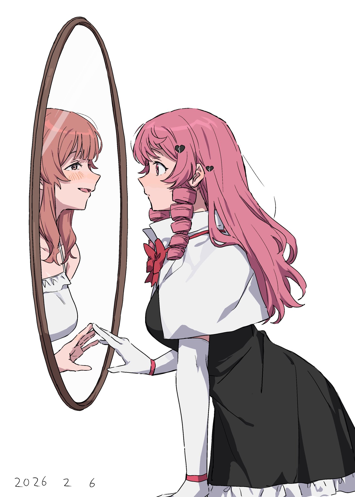 :d black_dress blush bow bowtie breasts capelet cowboy_shot dated dress drill_hair elbow_gloves from_side gloves hair_ornament heart heart_hair_ornament highres kirahoshi_aika large_breasts long_hair mirror open_mouth pink_hair red_bow red_bowtie shy_(series) smile takatisakana twin_drills white_capelet white_gloves