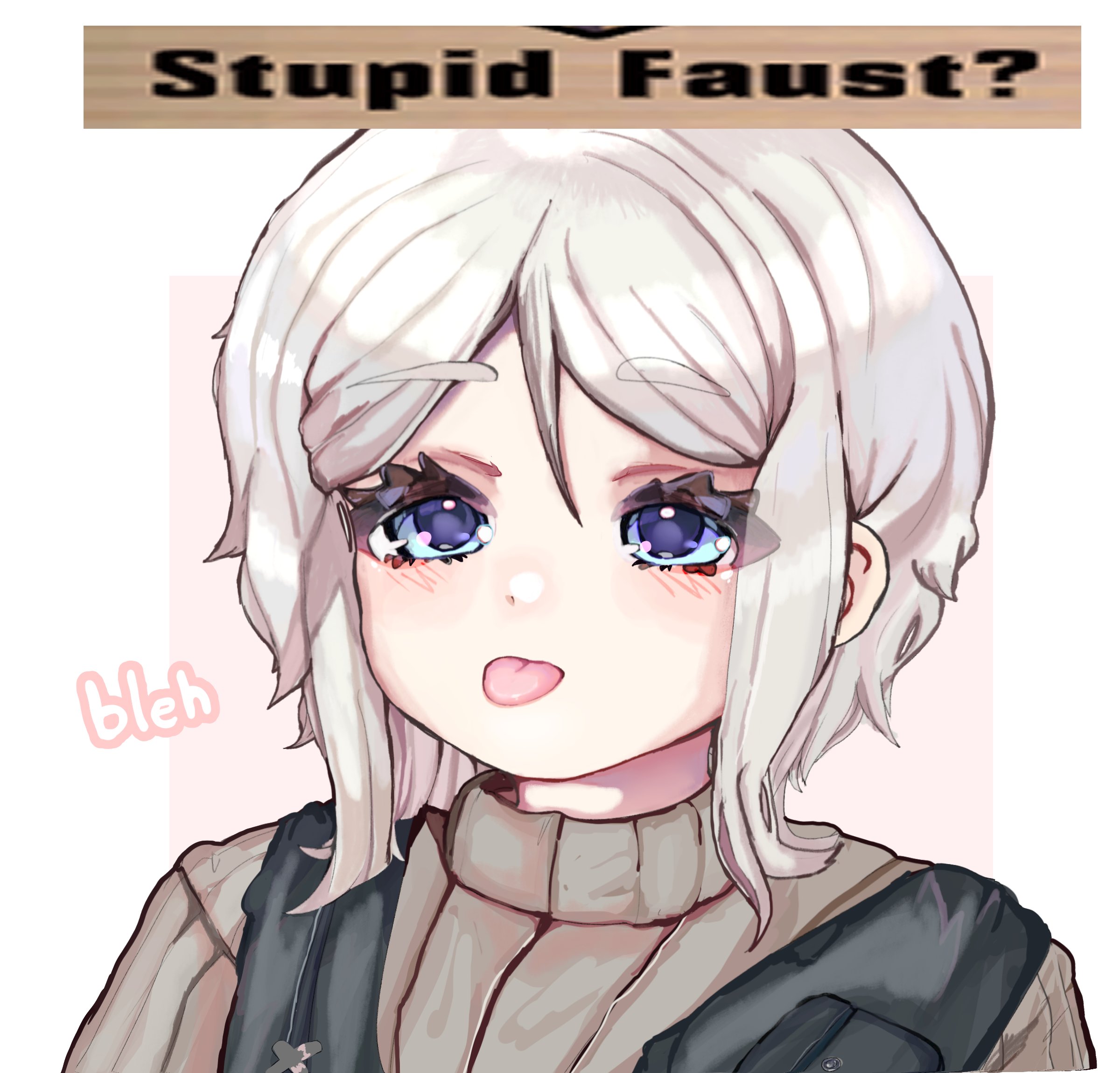 1girl ? black_vest blue_eyes commentary english_commentary english_text faust_(project_moon) heathcliffpyon highres limbus_company medium_hair project_moon simple_background solo sweater tongue tongue_out turtleneck turtleneck_sweater vest white_background white_hair