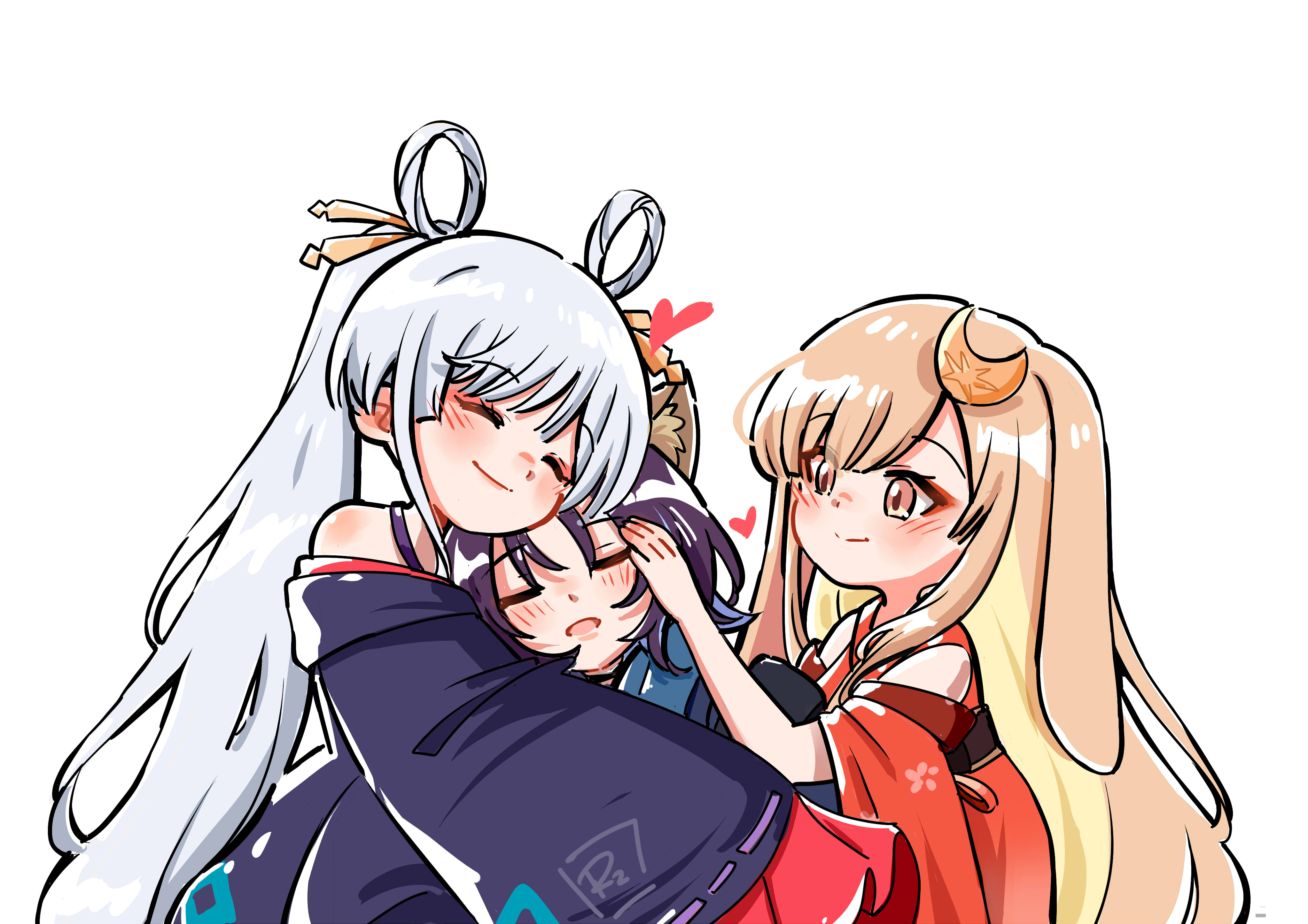 3girls ^_^ absurdres animal_ears bare_shoulders blonde_hair brown_eyes cho_kaguya-hime! closed_eyes commentary crescent crescent_hair_ornament eyeshadow frilled_sleeves frills girl_sandwich hair_ornament hair_rings hair_stick hand_on_another's_head headpat heart highres hug japanese_clothes kaguya_(cho_kaguya-hime!) kimono long_hair long_sleeves looking_at_another lop_rabbit_ears makeup multiple_girls open_mouth purple_hair rabbit_ears red_eyeshadow red_kimono renveriouz runami_yachiyo sakayori_iroha sandwiched short_hair smile twintails untranslatable_commentary white_background wide_sleeves