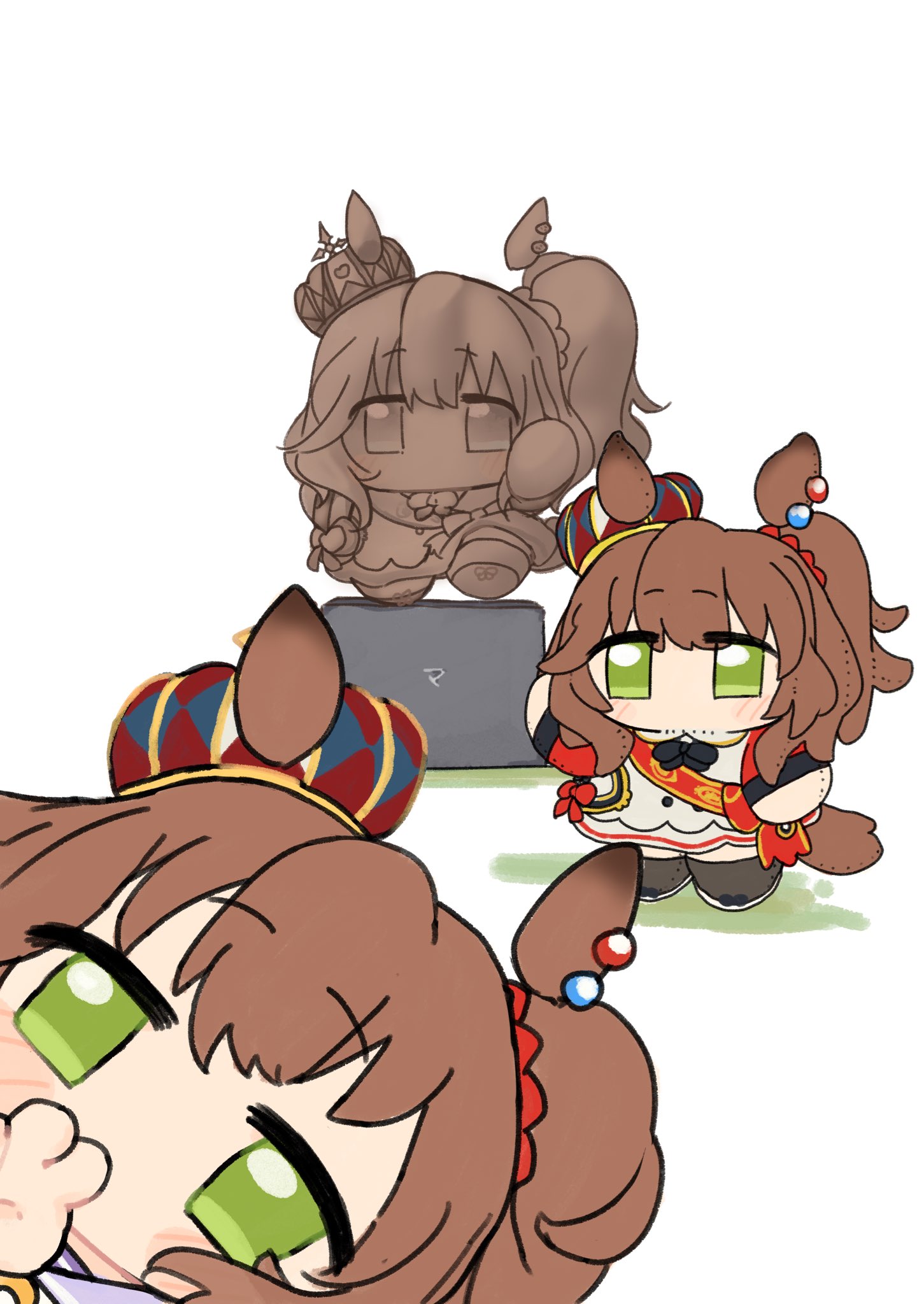 1girl 1other animal_ears ascot aston_machan_(umamusume) brown_hair chibi chibi_only close-up crown dress green_eyes highres horse_ears horse_girl medium_hair mengo_(captainmeteor6) red_sash sash school_uniform simple_background statue tail tracen_school_uniform umamusume waving white_background white_dress