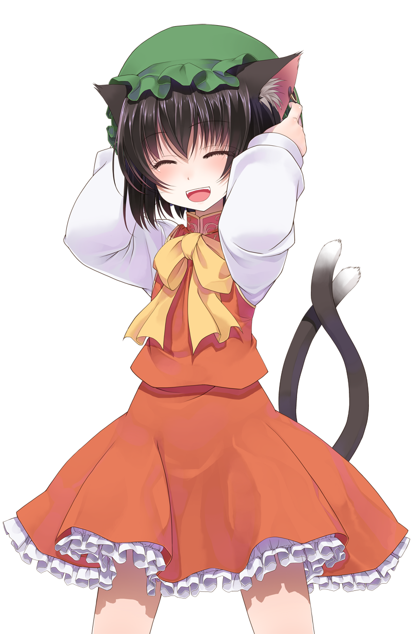 1girl :d ^_^ animal_ear_fluff animal_ears arms_behind_head arms_up bow brown_hair cat_ears cat_girl cat_tail chen closed_eyes commentary_request cowboy_shot crote facing_viewer frilled_skirt frills green_hat half-closed_eyes hat highres large_variant_set long_sleeves mob_cap multiple_tails nail_polish nekomata open_mouth petticoat red_skirt red_vest shirt short_hair skirt sleeve_cuffs sleeves_past_wrists smile standing tachi-e tail teeth touhou two_tails upper_teeth_only variant_set vest white_shirt yellow_bow